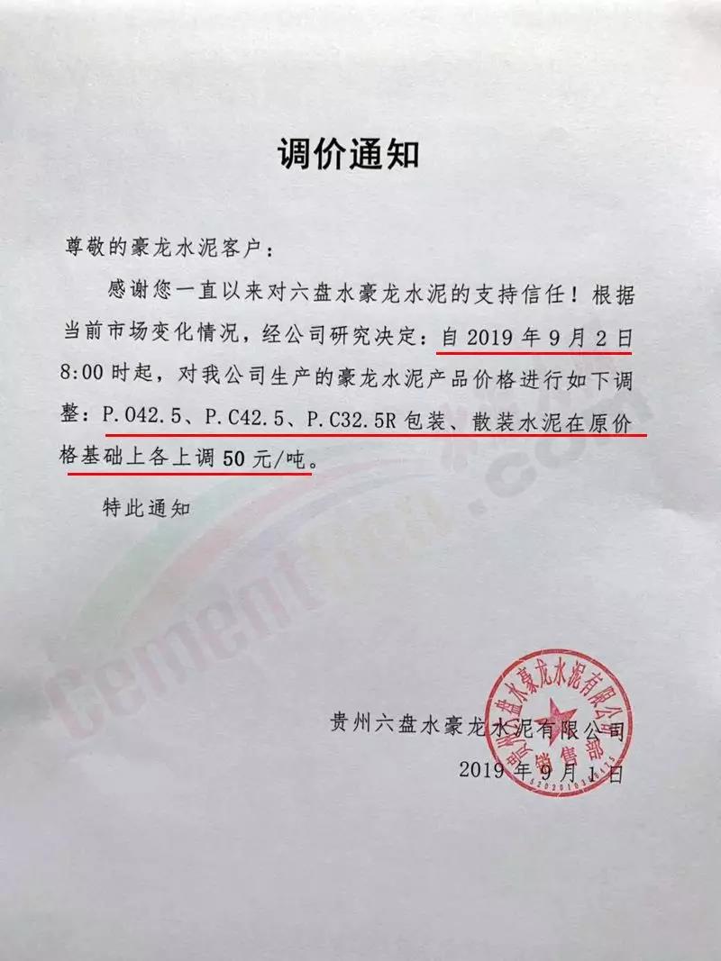 貴州六盤水豪龍水泥有限公司調價通知稱根據市場變化自9月2日8時起上調水泥價格,上調幅度50元/噸。