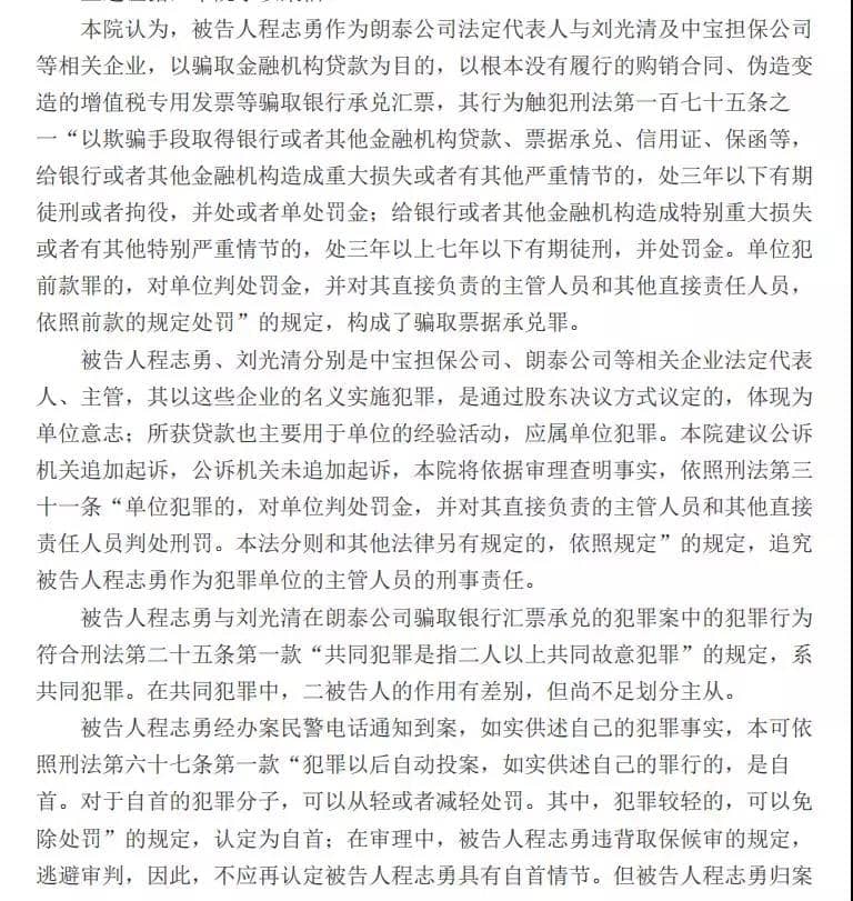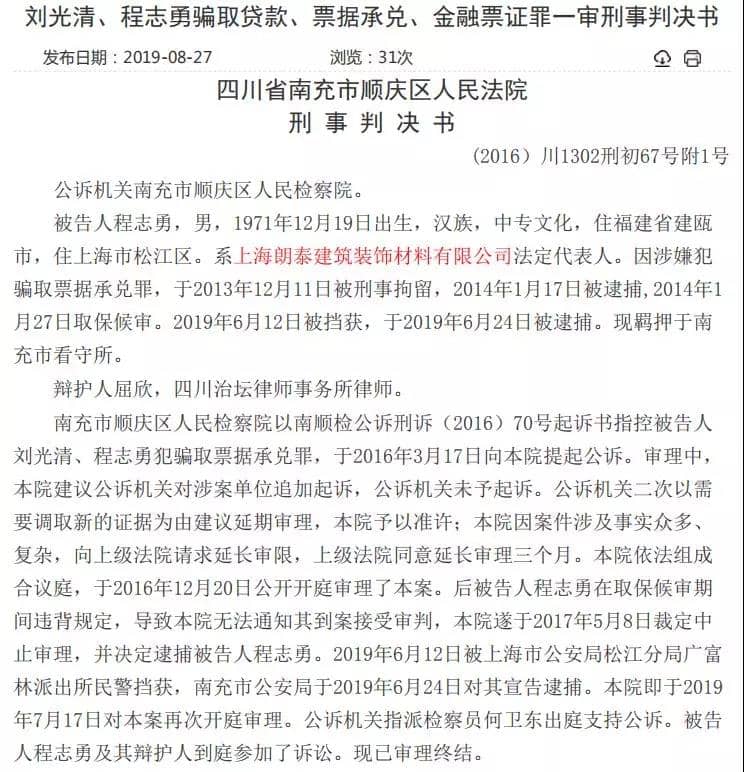 隨后南充市公安局以劉某清、程某勇等人涉嫌犯騙取票據承兌罪立案。判決書顯示,至2016年12月20日,郎泰公司尚欠本金185.36萬元,但程某勇的多出資產已被查封。