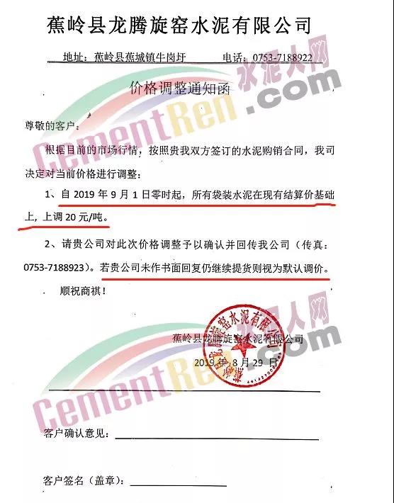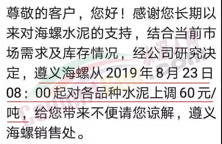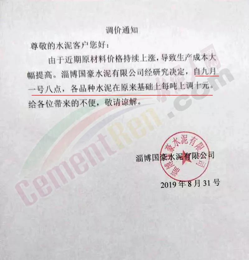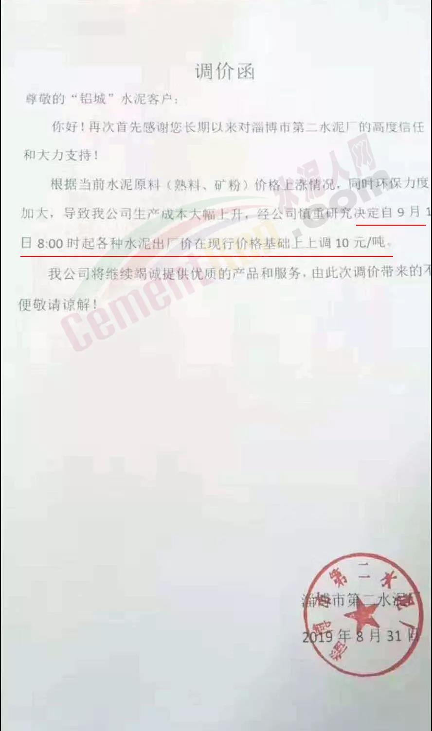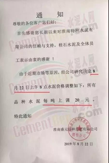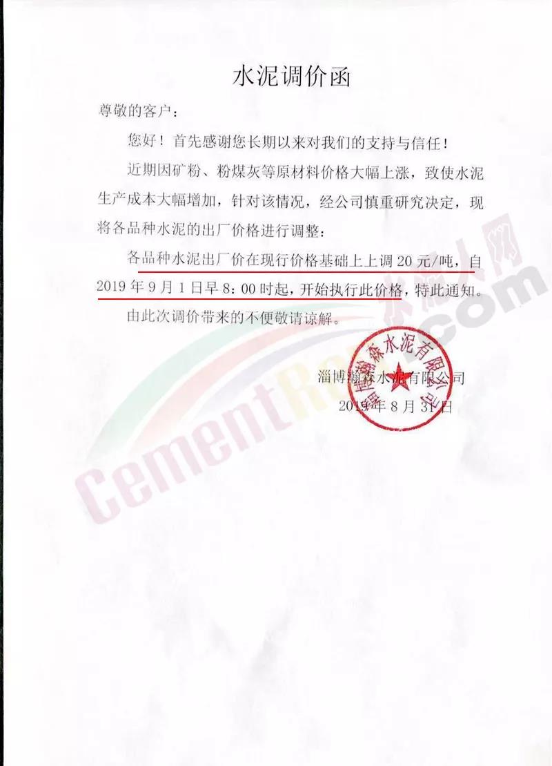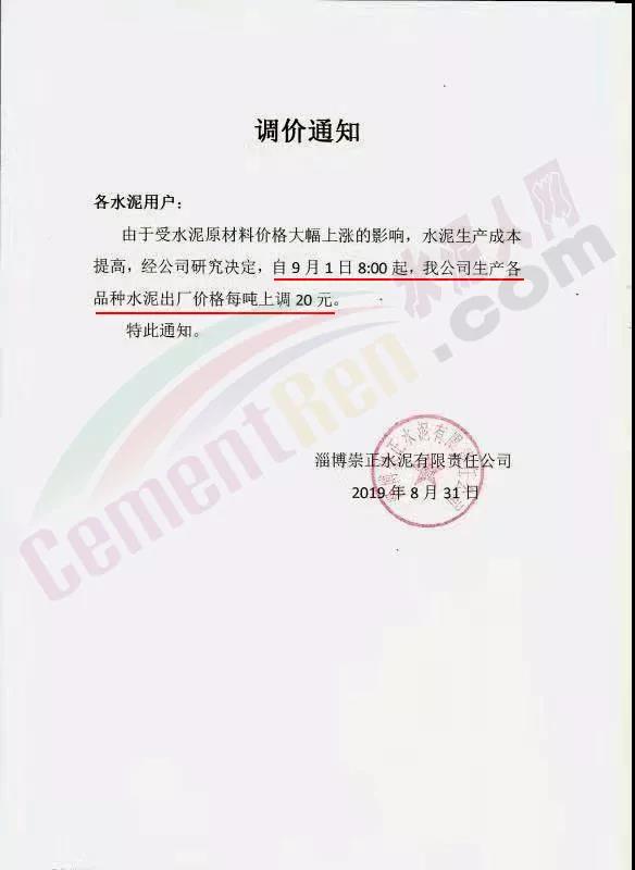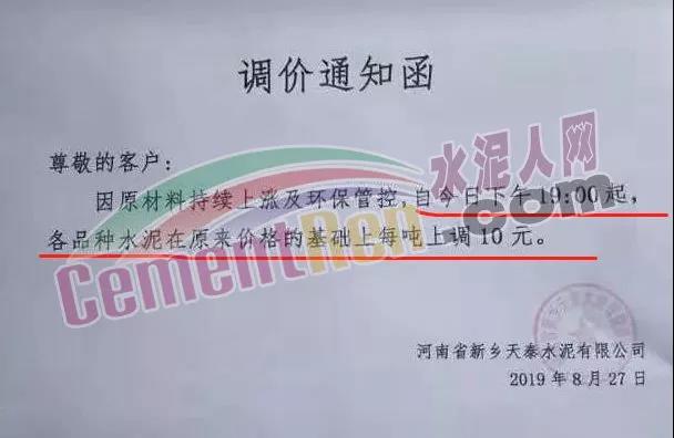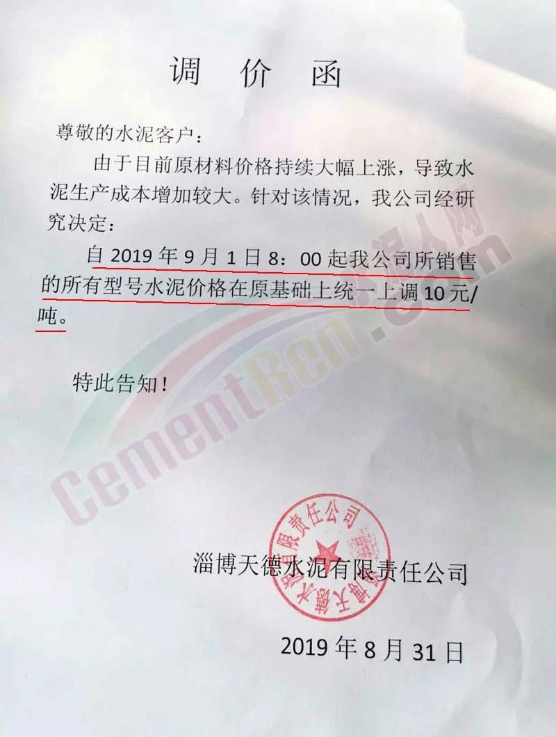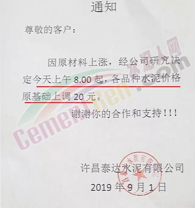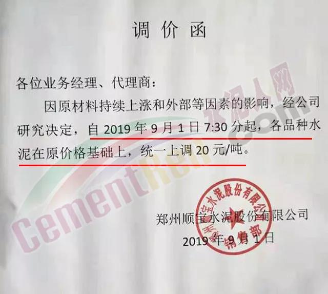 鄭州順寶水泥股份有限公司調價函稱:因原材料持續上漲和外部等因素影響,經公司研究決定,自2019年9月1日7:30起,各品種水泥在原價格基礎上,統一上調20元/噸。