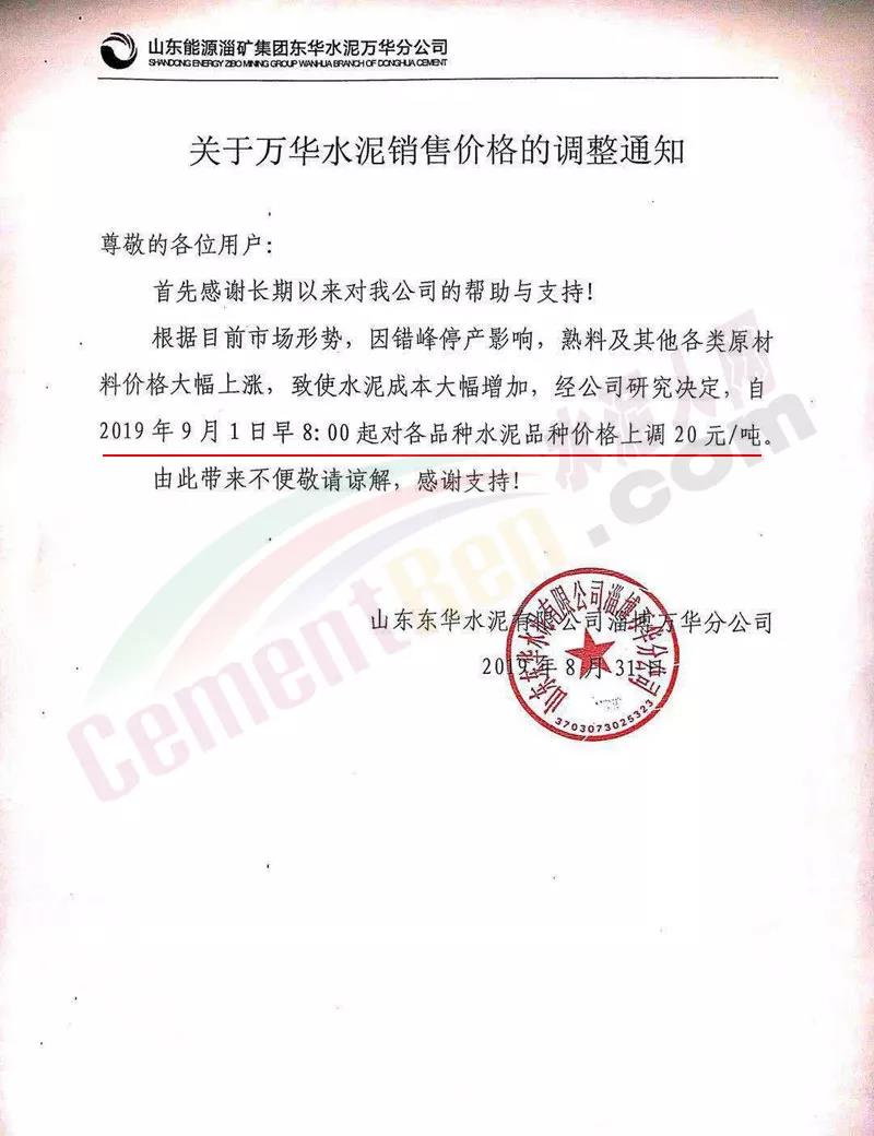 鄭州永華水泥有限公司發布調價函稱因原材料持續上漲和外部等因素影響,經公司研究決定,自2019年9月1日7:30起,各品種水泥在原價格基礎上,統一上調20元/噸。