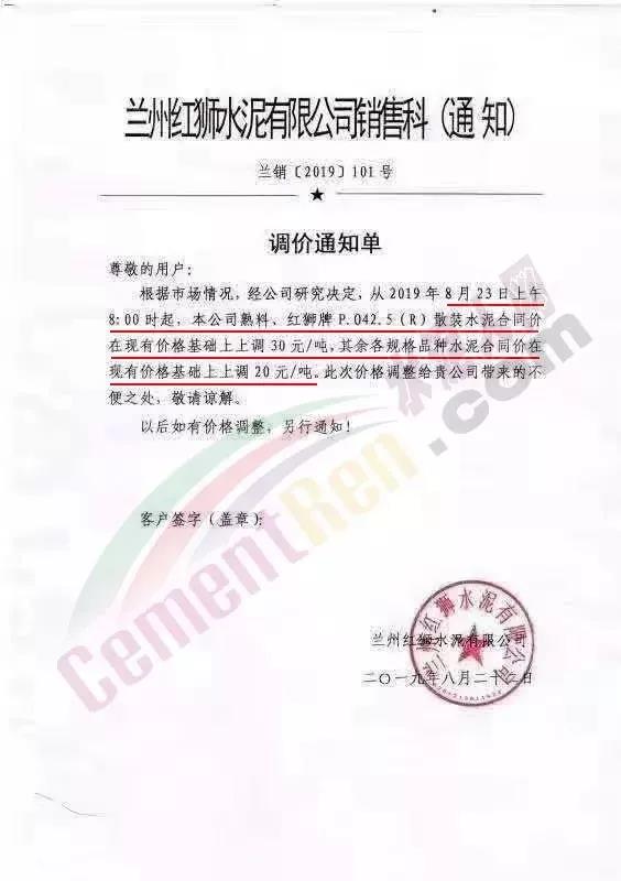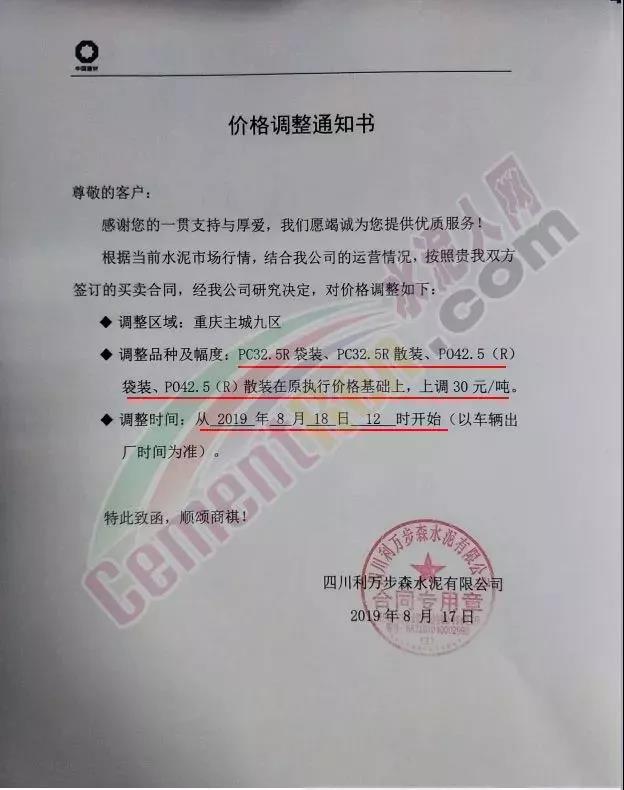 經公司研究決定,自2019年09月01日0:00時起,各品種等級袋裝水泥在原價格基礎上每噸上調20元。敬請知悉。