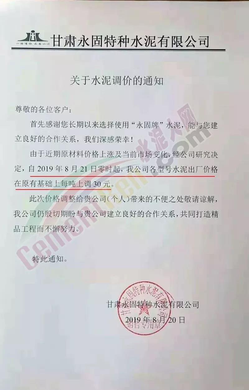 甘肅永固特種水泥有限公司《關于水泥調價的通知》稱,由于近期原材料價格上漲及當前市場變化 ,經公司研究決定 自8月21日零時起,公司各型號水泥出廠價格在原有基礎上每噸上調30元/噸。