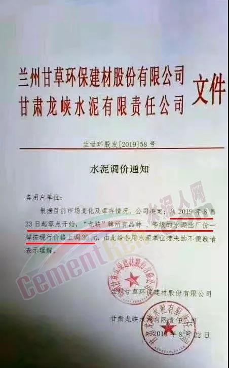 中材甘肅水泥有限責任公司《關于調整水泥銷售價格的通知》稱自2019年8月22日零時起對各品種水泥在現有價格基礎上上調30元/噸。