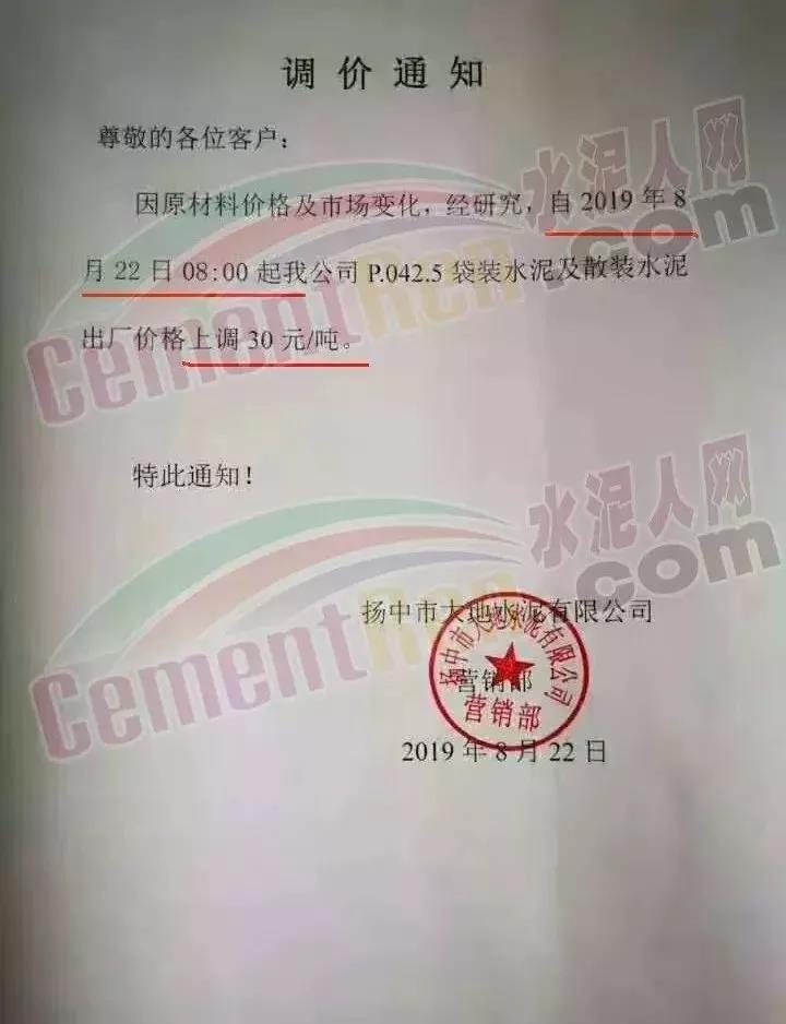 自2019年8月22日上午8時起,阜陽中聯水泥各品種水泥出廠價上調30元/噸。