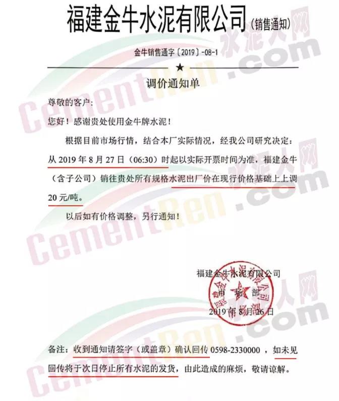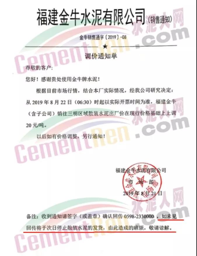 8月26日前后,福建區域多家水泥企業發布調價知稱上調水泥價格20-40元/噸。福建金牛水泥有限公司發布漲價通知稱,根據目前市場行情,結合本廠實際情況,經我公司研究決定,從2019年8月27日(6:30)時起以實際開票時間為準,福建金牛(含子公司)銷往貴州處所有規定水泥出廠價在現行價格基礎上上調 20元/噸。