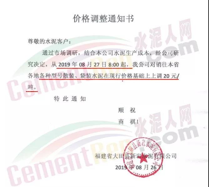 8月26日,福建省大田縣新巖水泥有限公司發布價格調通知稱:通過市場調研,結合本公司水泥生產成本,經公司研究決定,從2019年8月27日8:00起,我公司對銷往本省各地各種型號散裝、袋裝水泥在現行價格基礎上上調20元/噸。