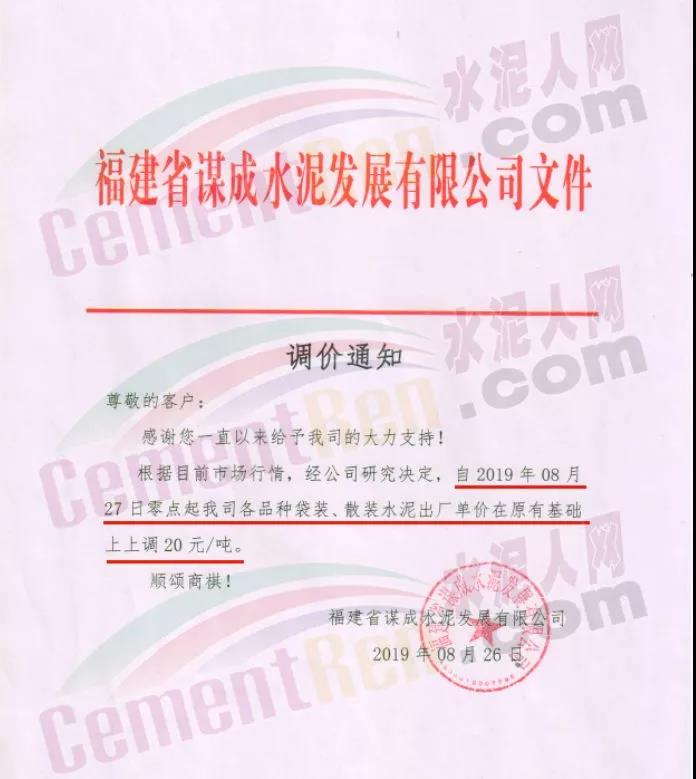 8月26日。福建省謀成水泥發展有限公司發布調價通知稱:根據目前市場行情,經公司研究決定,自2019年8月27日零時起,我司各品種袋裝、散裝水泥出廠單價在原有基礎上上調20元/噸,本次調價為謀成水泥8月份的第二調價,累計上調40元/噸。
