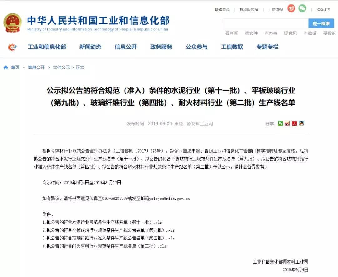 公示文件稱:根據《建材行業規范公告管理辦法》(工信部原〔2017〕278號),經企業自愿申報、省級工業和信息化主管部門核實推薦及專家復核,現將擬公告的符合水泥行業規范條件生產線名單(第十一批)、擬公告的符合平板玻璃行業規范條件生產線名單(第九批)、擬公告的符合玻璃纖維行業準入條件生產線名單(第四批)、擬公告的符合耐火材料行業規范條件生產線名單(第二批)予以公示,請社會各界監督。