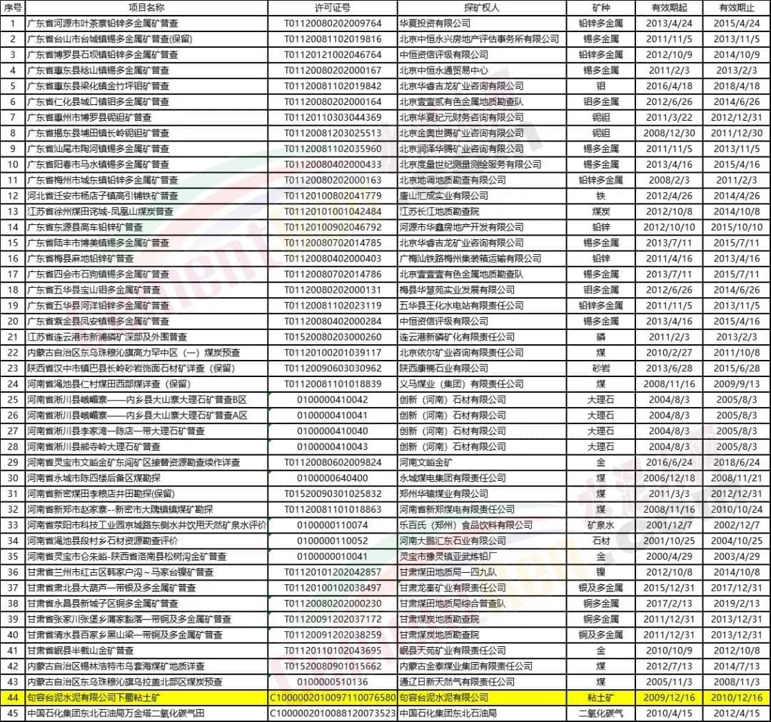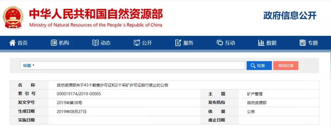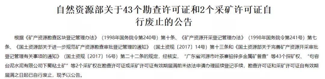 日前,自然資源部發布《關于43個勘查許可證和2個采礦許可證自行廢止的公告》稱:根據《礦產資源勘查區塊登記管理辦法》(1998年國務院令第240號)第十條、《礦產資源開采登記管理辦法》(1998年國務院令第241號)第七條、《國土資源部關于進一步規范礦產資源勘查審批登記管理的通知》(國土資規〔2017〕14號)第十三條和《國土資源部關于完善礦產資源開采審批登記管理有關事項的通知》(國土資規〔2017〕16號)第二十二條的規定,經核實,“廣東省河源市葉茶寨鉛鋅多金屬礦普查”等43個探礦權、“句容臺泥水泥有限公司下蜀粘土礦”等2個采礦權在勘查許可證或采礦許可證有效期屆滿前未依法申請辦理延續登記手續,勘查許可證和采礦許可證自有效期屆滿之日起已自行廢止,現予以公告。