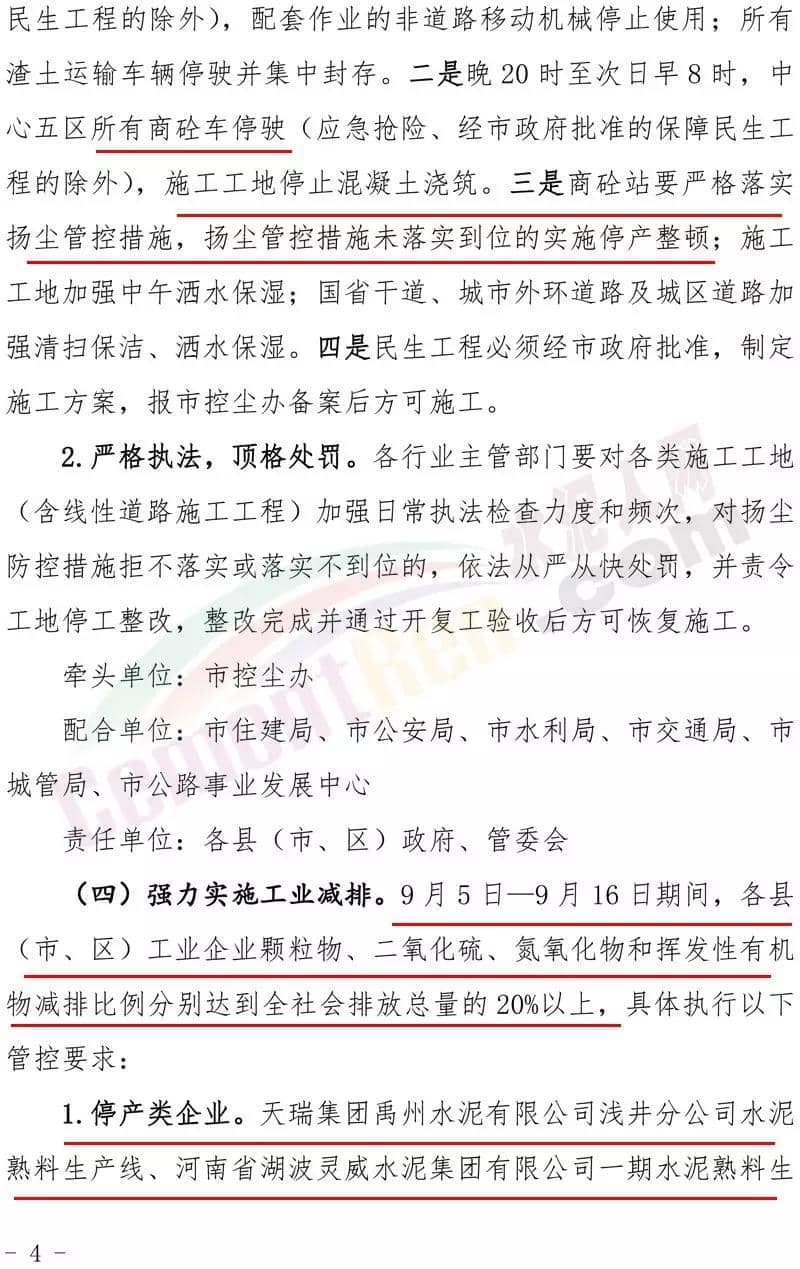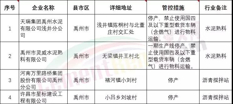 1、停產類企業。天瑞集團禹州水泥有限公司淺井分公司水泥熟料生產線、河南省湖波靈威水泥集團有限公司一期水泥熟料生產線、燒結磚瓦企業(9月6日前停產到位)、瀝青攪拌站自9月5日起停產到位。