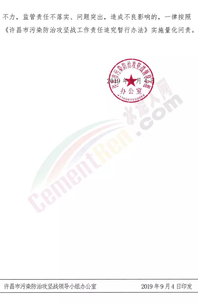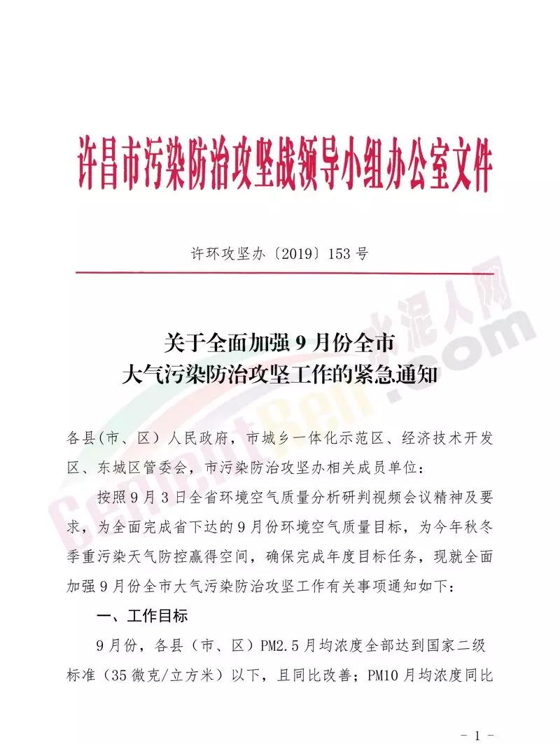 水泥人網消息:日前,許昌市污染防治攻堅戰領導小組辦公室發布《關于全面加強9月份全市大氣污染防治攻堅工作的緊急通知》稱按照9月3全省環境空氣質量分析研判視頻會議精神及要求,為全面完成河南省下達的9月份環境空氣質量目標,為今年秋冬季重污染天氣防控贏得空間,確保完成年度目標任務,就全面加強9月份全市大氣污染防治攻堅工作有關事項中包括強力實施工業減排,9月5日~16日期間,各縣(市、區)工業企業顆粒物、二氧化硫、氮氧化物和揮發性有機物減排比例分別達到全社會排放總量20%以上。具體招待以下管控要求為: