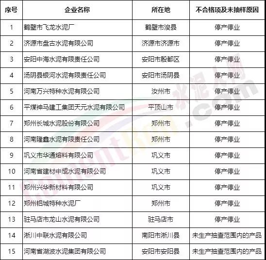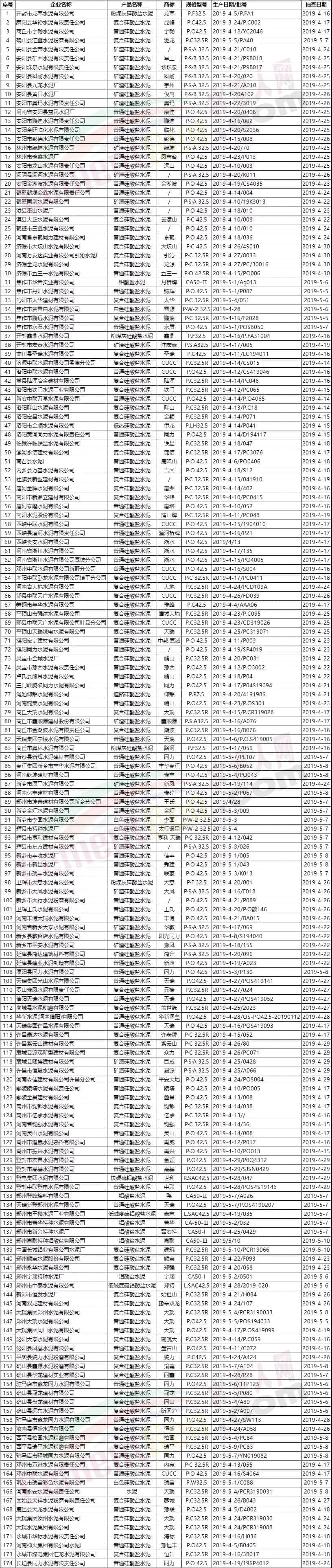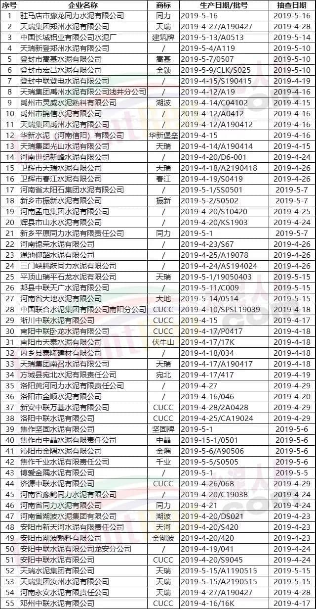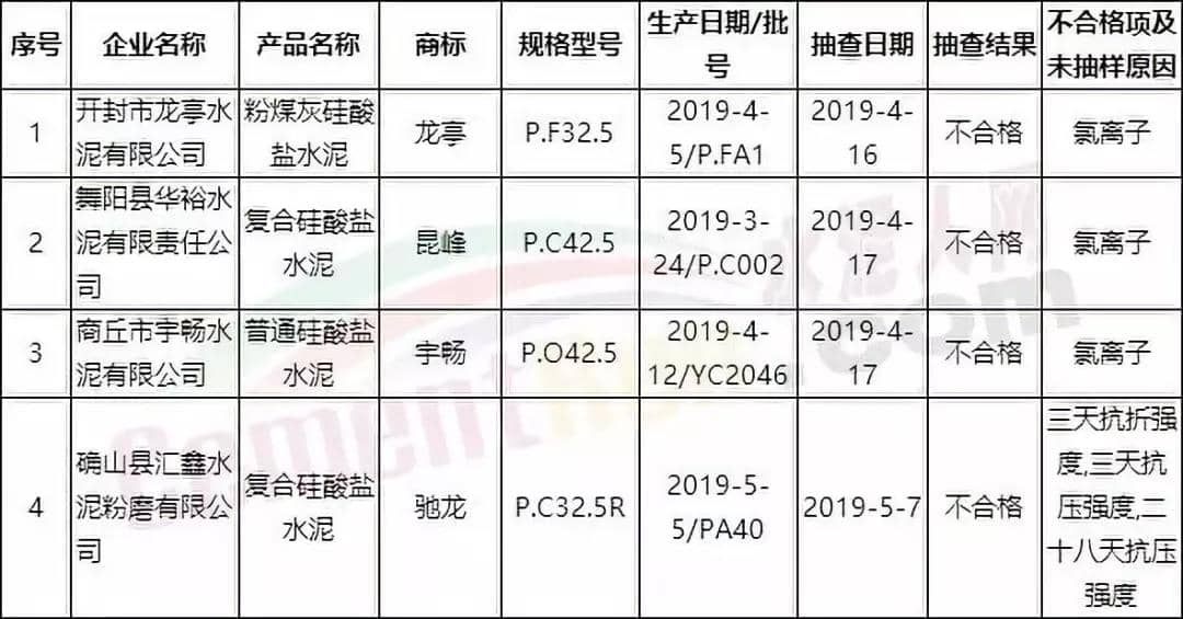4批次產品不合格。承檢機構為河南省水泥質量監督檢驗中心。