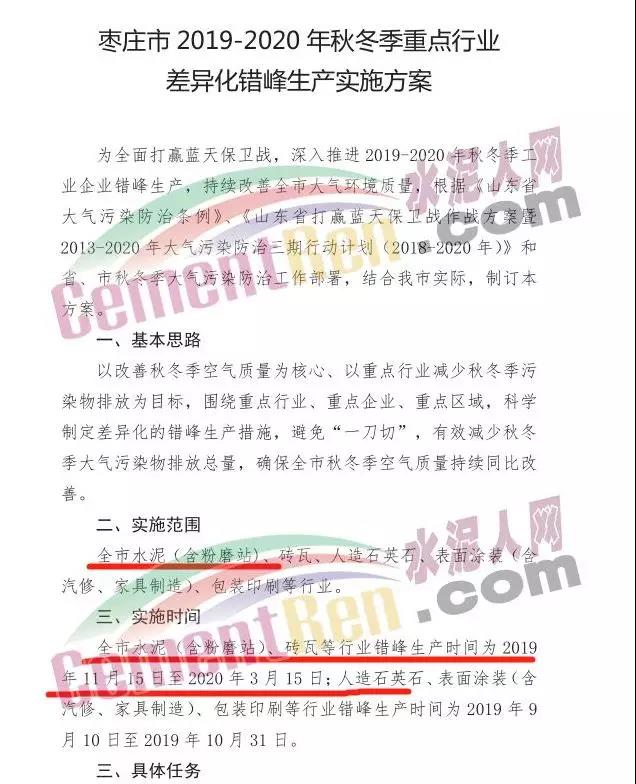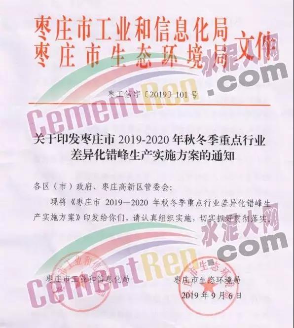 與此同時,水泥大省山東省棗莊市工業(yè)和信息化局、棗莊市生態(tài)環(huán)境局發(fā)布《關(guān)于棗莊市2019~2020年秋冬季重點行業(yè)差異化錯峰生產(chǎn)實施方案的通知》稱,為全面打贏藍(lán)天保衛(wèi)戰(zhàn),深入推進(jìn)2019~2020年秋冬季工業(yè)企業(yè)錯峰生產(chǎn),持續(xù)改善全市大氣環(huán)境質(zhì)量,根據(jù)《山東省大氣污染防治條例》、《山東省打贏藍(lán)天保衛(wèi)戰(zhàn)作戰(zhàn)方案暨2013~2020年大氣污染防治三期行動計劃(2018~2020年)》和省、市秋冬季大氣污染防治工作部署,結(jié)合我市實際,制定本方案。