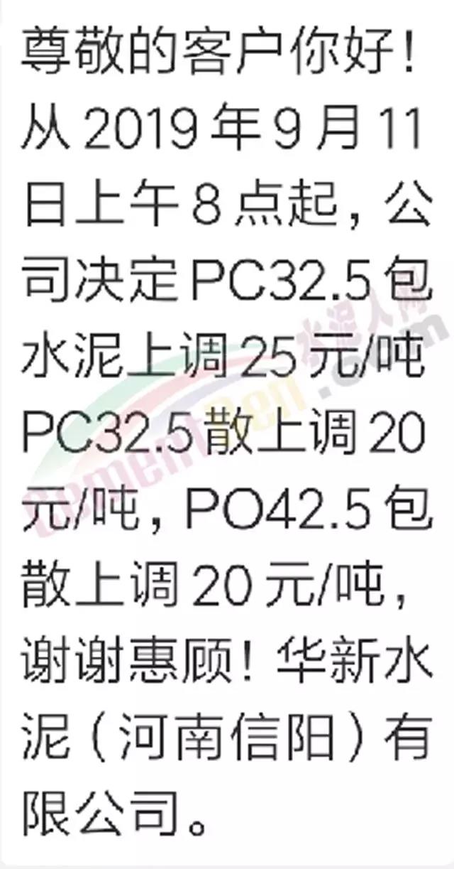 其中,華新水泥(河南信陽)有限公司11日發通知稱自9月11日上午8點起PC32.5包裝水泥價格上調25元/噸,散裝上 調20元/噸。PO42.5水泥(包散)上 調20元/噸。