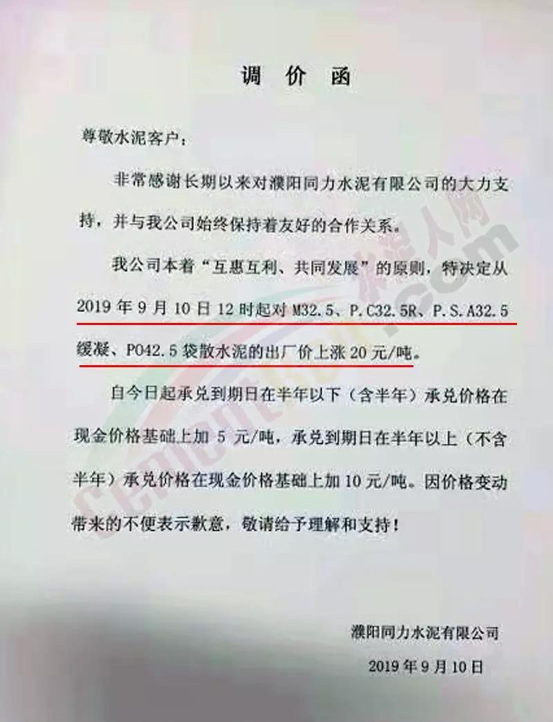 濮陽同力水泥有限公司9月10日調價函稱,自9月10日12時起對旗下多個32.5級水泥及PO.42.5袋散水泥出廠價上調20元/噸。