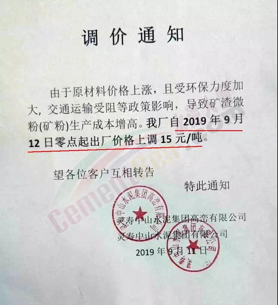 據水泥人網了解,位于河北省石家莊市靈壽縣的靈壽中山水泥集團高巒有限公司昨日(9月11)發調價通知稱,由于原材料價格上漲,且受環保力度加大,交通運輸受陰等政策影響,導致礦渣微粉(礦粉)生產成本增高。工廠自今日(9月12日)零點起出廠價格上調25元/噸。