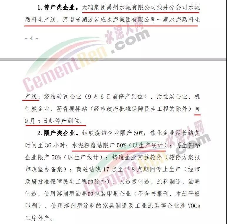天瑞集團(tuán)禹州水泥有限公司淺井分公司水泥熟料生產(chǎn)線、河南省湖波靈威水泥集團(tuán)有限公司一期水泥熟料生產(chǎn)線、燒結(jié)磚瓦企業(yè)(9月6日前停產(chǎn)到位)、活性炭企業(yè)、機(jī)制炭企業(yè)、瀝青攪拌站(經(jīng)市政府批準(zhǔn)保障民生工程的除外)自 9月5日起停產(chǎn)到位。