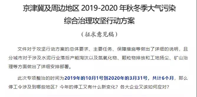 日前,水泥人網轉發了《京津冀及周邊地區2019-2020 年秋冬季大氣污染綜合治理攻堅行動方案(征求意見稿)》。并有針對性的劃出了重點。其中提到國家相關部門將于2019年的10月1日到2020年的3月31日對2+26城市進行環境問題專項整治 。(相關鏈接:“停工令”又來了!為期6個月!涉及28個城市!)消息一出,引起廣泛關注。有網友留言稱,停限產或將導致一波水泥價格上漲。