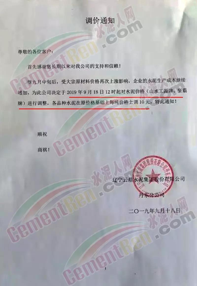 據了解,上述水泥價格上漲多因上游原材料礦粉,混合材,以及煤炭價格上調導致的成本增加繼而傳導漲價。亦有部分是政策面因素,停限產導致部分區域庫位較低,供應不足。為保供重點項目,部分企業上調了水泥價格。昨日(9月18日)遼寧云鼎水泥集團 股份有限公司發布調價通知稱,繼九月中旬后,受大宗原材料價格再次上漲影響,企業的水泥生產成本繼續增加,為此公司決定于9月18日12時起對水泥價格(山水工源牌、堅霸牌)進行調整,各品種水泥在原價格基礎上每噸價格上調10元。