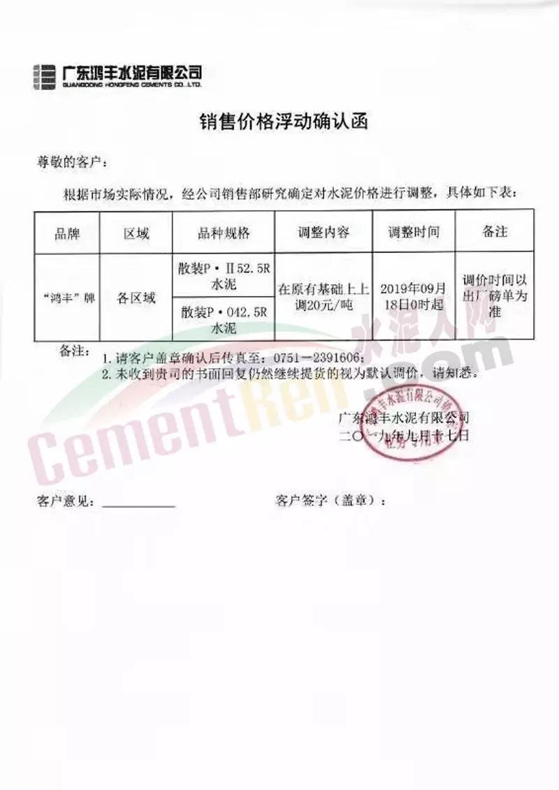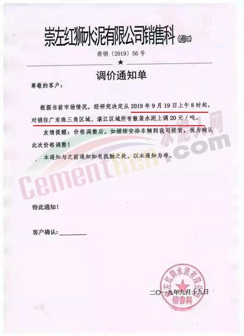 水泥人網消息:日前,崇左紅獅水泥銷售科通知:自今日(9月19日)上午8時起對銷往廣東珠三角、湛江區域區域所有散裝水泥上調20元/噸。