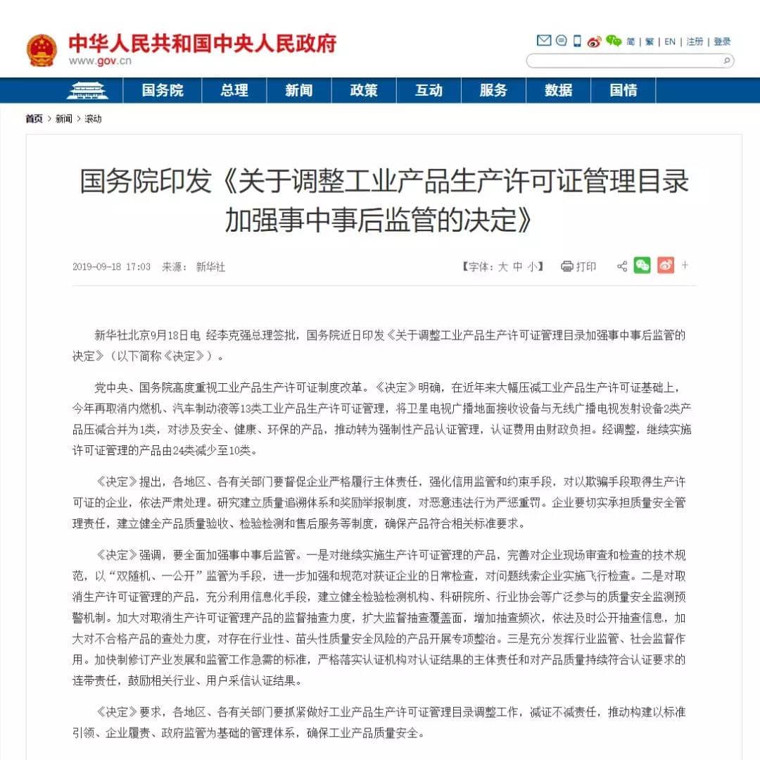 文件稱:黨中央、國務院高度重視工業產品生產許可證制度改革。《決定》明確,在近年來大幅壓減工業產品生產許可證基礎上,今年再取消內燃機、汽車制動液等13類工業產品生產許可證管理,將衛星電視廣播地面接收設備與無線廣播電視發射設備2類產品壓減合并為1類,對涉及安全、健康、環保的產品,推動轉為強制性產品認證管理,認證費用由財政負擔。經調整,繼續實施許可證管理的產品由24類減少至10類。《決定》提出,各地區、各有關部門要督促企業嚴格履行主體責任,強化信用監管和約束手段,對以欺騙手段取得生產許可證的企業,依法嚴肅處理。研究建立質量追溯體系和獎勵舉報制度,對惡意違法行為嚴懲重罰。企業要切實承擔質量安全管理責任,建立健全產品質量驗收、檢驗檢測和售后服務等制度,確保產品符合相關標準要求。《決定》強調,要全面加強事中事后監管。一是對繼續實施生產許可證管理的產品,完善對企業現場審查和檢查的技術規范,以“雙隨機、一公開”監管為手段,進一步加強和規范對獲證企業的日常檢查,對問題線索企業實施飛行檢查。二是對取消生產許可證管理的產品,充分利用信息化手段,建立健全檢驗檢測機構、科研院所、行業協會等廣泛參與的質量安全監測預警機制。加大對取消生產許可證管理產品的監督抽查力度,擴大監督抽查覆蓋面,增加抽查頻次,依法及時公開抽查信息,加大對不合格產品的查處力度,對存在行業性、苗頭性質量安全風險的產品開展專項整治。三是充分發揮行業監管、社會監督作用。加快制修訂產業發展和監管工作急需的標準,嚴格落實認證機構對認證結果的主體責任和對產品質量持續符合認證要求的連帶責任,鼓勵相關行業、用戶采信認證結果。