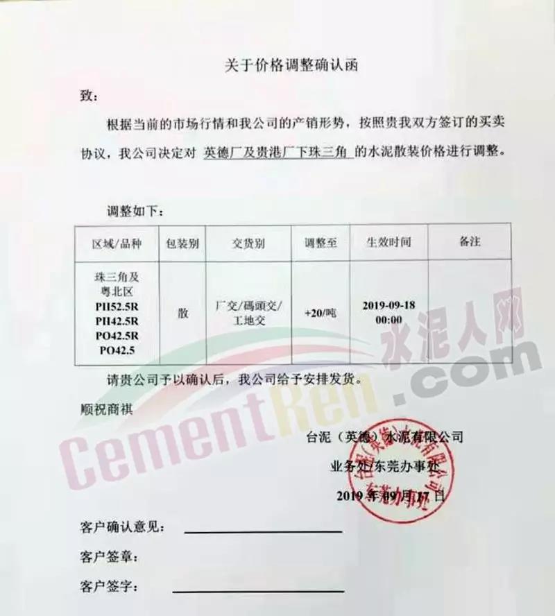 臺泥(英德)水泥有限公司通知自9月18日0時起對珠三角及粵北區(qū)域PO42.5及以上標(biāo)號散裝水泥上調(diào)20元/噸。