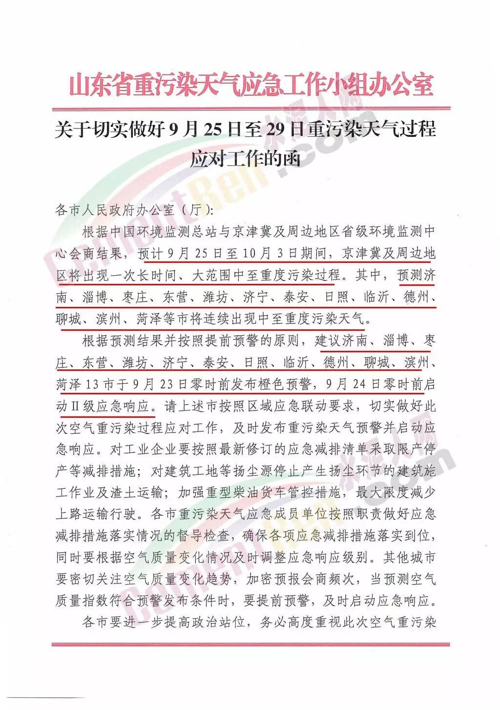 山東省13個(gè)市今日零點(diǎn)前啟動(dòng)大氣應(yīng)急方案!水泥企業(yè)停限產(chǎn)!山東省重污染天氣應(yīng)急工作小組辦公室《關(guān)于切實(shí)做好9月25日至29日重污染天氣過程應(yīng)對工作的函》稱:預(yù)計(jì)9月25日至10月3日期間,京津冀及周邊地區(qū)將出現(xiàn)一次長時(shí)間、大范圍中至重度污染過程。其中預(yù)測濟(jì)南、淄博、棗莊、濟(jì)寧、泰安、日照、荷澤等13市將連續(xù)出現(xiàn)中至重度污染天氣,根據(jù)預(yù)測結(jié)果并按照提前預(yù)警的原則,建議濟(jì)南、淄博、棗莊、東營、濰坊、濟(jì)寧、泰安、日照、臨沂、德州、聊城、濱州、荷澤13市于今日(9月23日)零時(shí)前啟動(dòng)II級應(yīng)急響應(yīng)。并請上述13市按照區(qū)域應(yīng)急聯(lián)動(dòng)要求,切實(shí)做好此次空氣重污染過程應(yīng)對工作。對工業(yè)企業(yè)要按照最新修訂的應(yīng)急減排清單采取限產(chǎn)停產(chǎn)等減排措施。對建筑工地?fù)P塵源停止產(chǎn)生揚(yáng)塵環(huán)節(jié)的建筑施工作業(yè)及渣土運(yùn)輸;加強(qiáng)重型柴油車管控措施,最大限度減少上路運(yùn)輸行駛。
