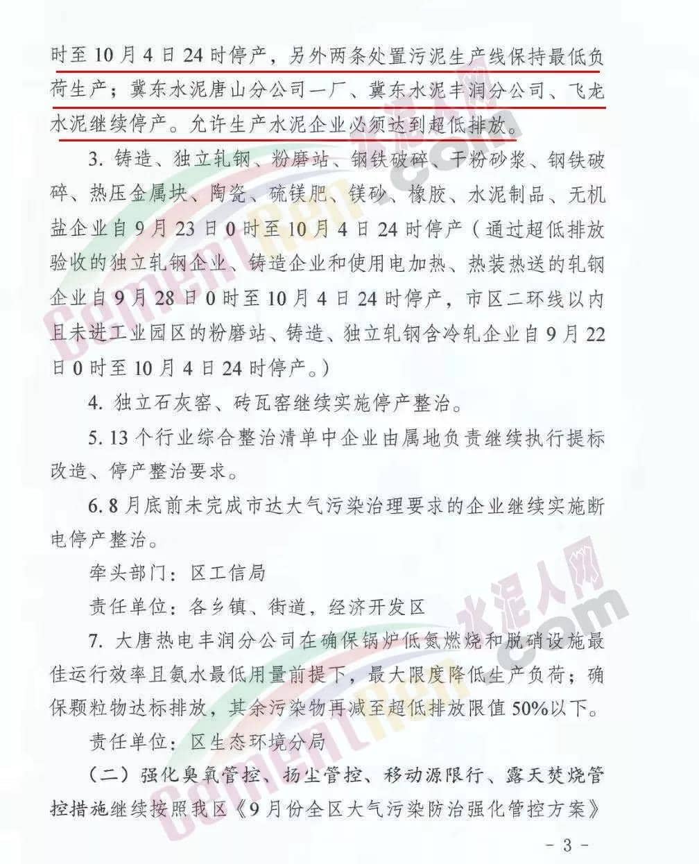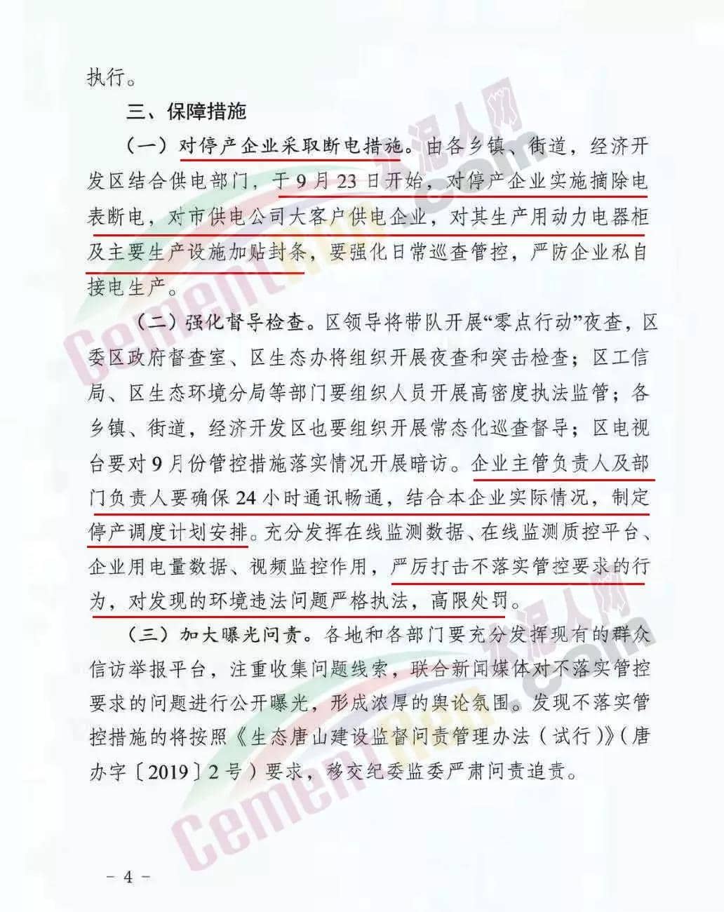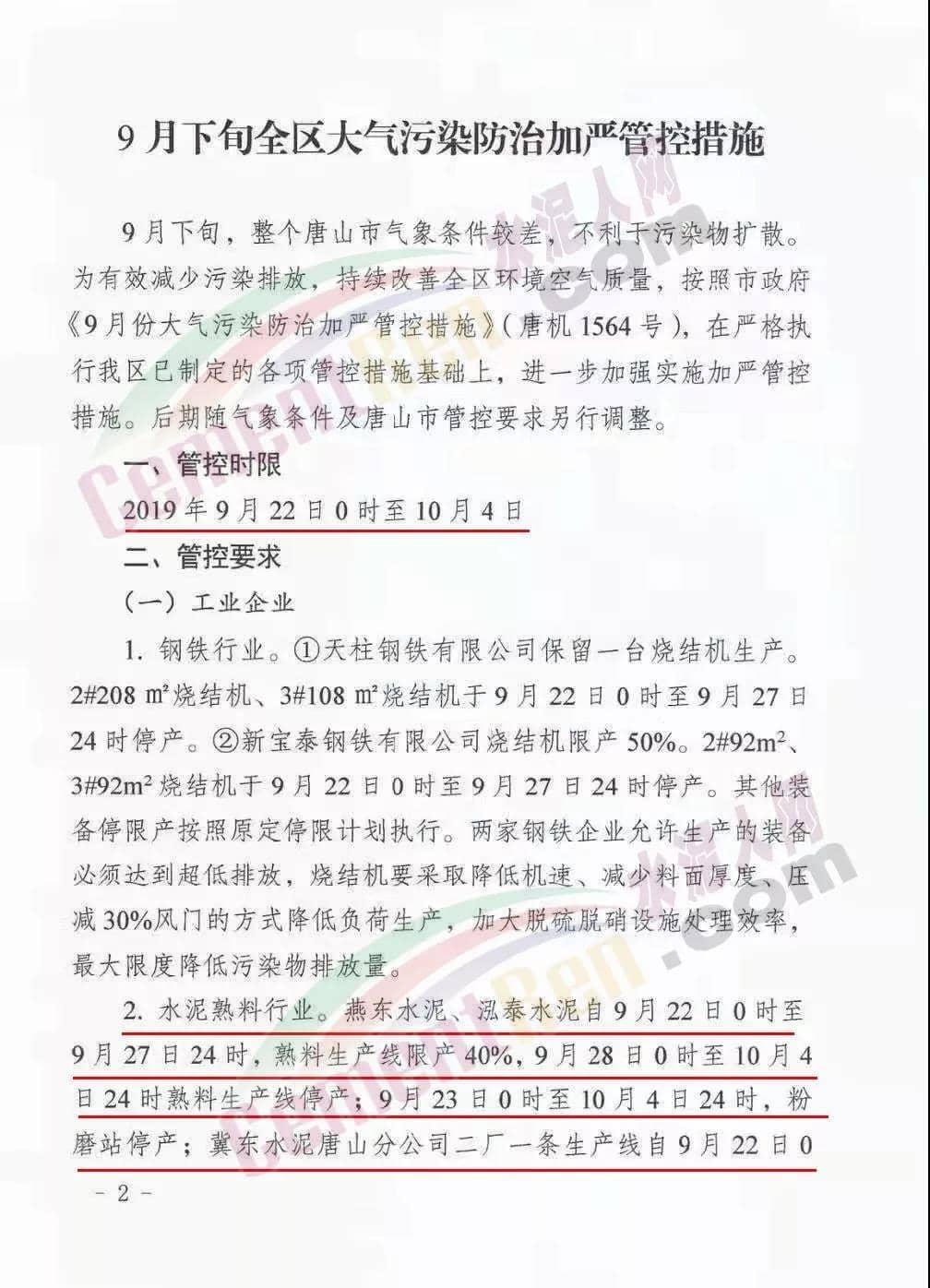 管控時(shí)限:2019年9月22日0時(shí)至10月4日水泥熟料行業(yè):一、燕東水泥、泓泰水泥自9月22日0時(shí)至9月27日24時(shí),熟料生產(chǎn)線限產(chǎn)40%,9月28日0時(shí)至10月4日24時(shí)熟料生產(chǎn)線停產(chǎn);9月23日0時(shí)于10月4日24時(shí),粉磨站停產(chǎn);二、冀東水泥唐山分公司二廠一條生產(chǎn)線自9月22日0時(shí)至10月4日24時(shí)停產(chǎn),另外兩條處置污泥生產(chǎn)線保持最低負(fù)荷生產(chǎn);三、冀東水泥唐山分公司一廠、冀東水泥豐潤分公司、飛龍水泥繼續(xù)停產(chǎn)。允許生產(chǎn)的水泥企業(yè)必須達(dá)到超低排放。對于停產(chǎn)企業(yè)采取斷電措施,由各鄉(xiāng)鎮(zhèn)、街道、經(jīng)濟(jì)開發(fā)區(qū)結(jié)合供電部門,于9月23日開始,對停產(chǎn)企業(yè)實(shí)施摘除電表斷電,對市供電公司大客戶供電企業(yè),對其生產(chǎn)用動(dòng)力電器柜及主要生產(chǎn)設(shè)施加貼封條,要強(qiáng)化日常巡查管控,嚴(yán)防企業(yè)私自接電生產(chǎn)。強(qiáng)化督導(dǎo)檢查期間,區(qū)領(lǐng)導(dǎo)將帶隊(duì)開展“零點(diǎn)行動(dòng)”夜查,區(qū)委區(qū)政府督查室、區(qū)生態(tài)辦將組織開展夜查和突擊檢查等,區(qū)電視臺要對9月份管控措施落實(shí)情況開展暗訪。企業(yè)主管負(fù)責(zé)人及部分負(fù)責(zé)人要確保24小時(shí)通訊申通,結(jié)合本企業(yè)實(shí)際情況,制定停產(chǎn)調(diào)度計(jì)劃安排。嚴(yán)厲打擊不落實(shí)管控要求的行為,對發(fā)現(xiàn)的環(huán)境違法問題嚴(yán)格執(zhí)法,高限處罰。《9月下旬大氣污染防治加嚴(yán)管控措施》全文如下: