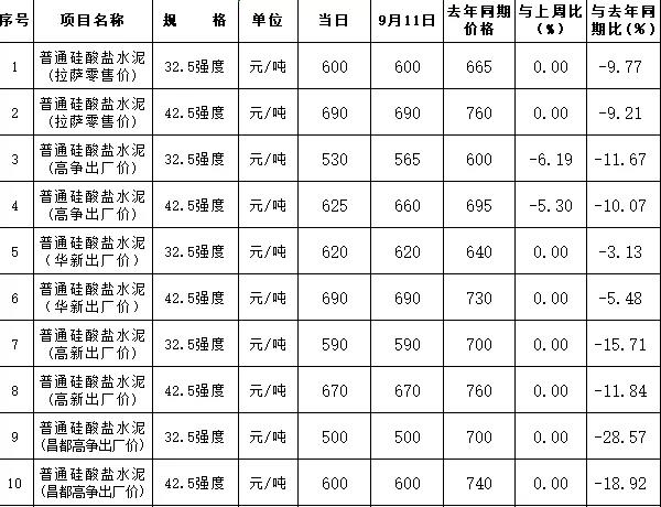 西藏自治區發展和改革委員會發布拉薩市場主要建材價格周報。據監測數據顯示,2019年第38周,全區水泥價格小幅下降,鋼材、木材、玻璃、民爆物品價格平穩。水泥:1、重點項目價格執行情況:高爭建材、華新水泥、高新雪蓮、昌都高爭針對全區重點項目銷售的水泥繼續執行政府指導價,分別為32.5(強度)500元、42.5(強度)600元、52.5(強度)800元。2、非重點項目出廠價格:拉薩高爭環比分別下降6.19%、5.3%;其余三家企業針對全區非重點項目供應的水泥出廠價格與上周比持平。3、拉薩市場平均零售價:與上周比,拉薩市場32.5(強度)、42.5(強度)水泥價格持平;與去年同期比,32.5(強度)、42.5(強度),同比分別下降9.77%、9.21%。