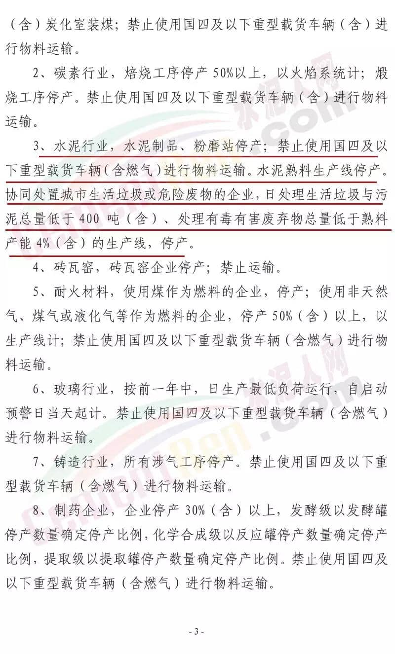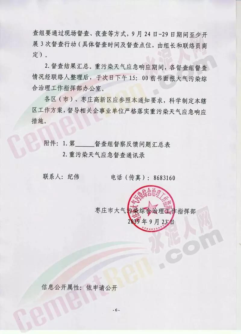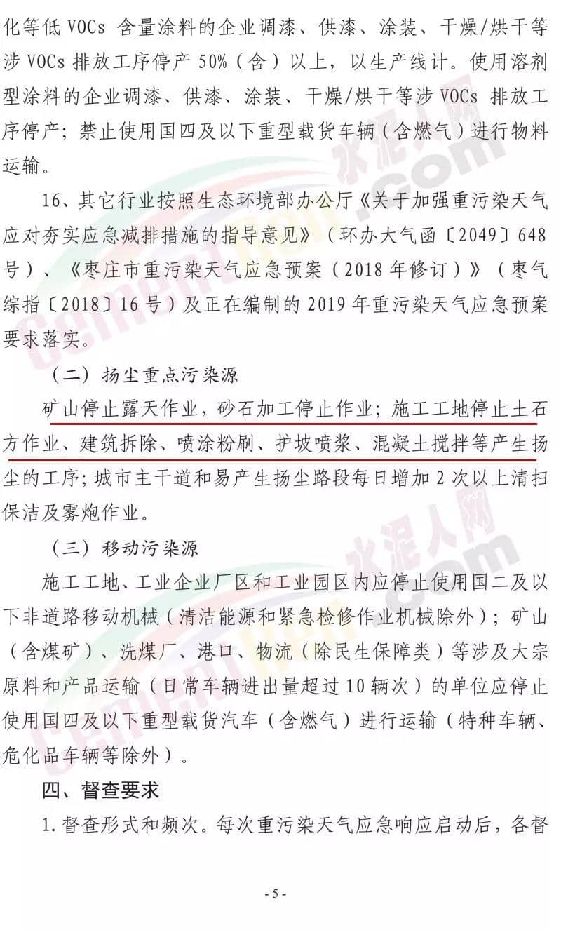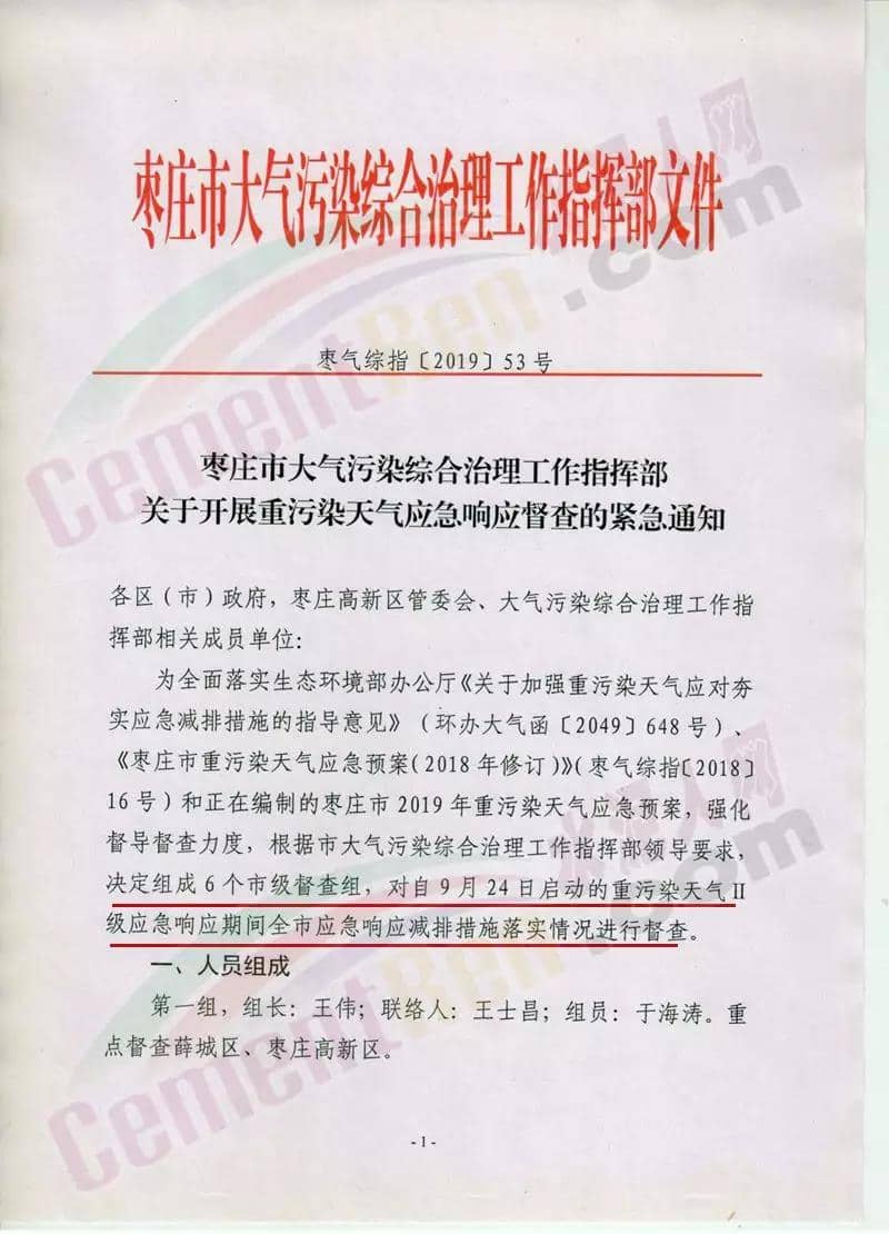日前,山東省棗莊市大氣污染綜合治理工作指揮部發(fā)布《關(guān)于開展重污染天氣應(yīng)急響應(yīng)督查的緊急通知》稱將組成6個(gè)市級督查組,對9月24日啟動的重污染天氣II級應(yīng)急響應(yīng)期間全市應(yīng)急響應(yīng)減排措施落實(shí)情況進(jìn)行督查。水泥行業(yè),水泥制品,粉磨站停產(chǎn);禁止使用國四及以下重型載貨車輛(含 燃?xì)?進(jìn)行物料運(yùn)輸。水泥熟料生產(chǎn)線停產(chǎn)。協(xié)同處置城市生活垃圾或危廢的企業(yè),日處理生活垃圾與污泥總量低于400噸(含)、處理有毒有害廢棄物總量低于熟料產(chǎn)能4%(含)的生產(chǎn)線停產(chǎn)。通知原文如下: