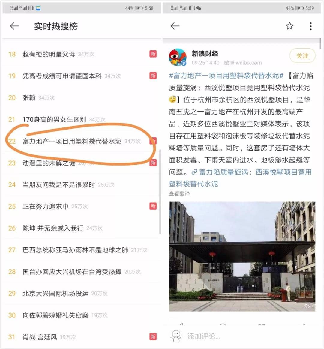 但7月準備入住時,他發現房間里的霉菌味道一直未散盡,這才發現門套、電視機背景墻、主臥室背景墻等都是由泡沫板、垃圾袋等填充。正是這些泡沫板、垃圾袋和紙板造成了霉菌味道。該業主表示,此前一直就上述問題與富力溝通,但富力方面回應并不及時。直到業主將這些問題發到業主群里,富力第一次主動聯系業主,表示會維修,并會補償一些物業費。對于富力提出的解決方案,這位業主并不滿意,他要求富力除了對上述問題進行維修外,還要補償從去年7月交房至今的房租。從開發商的角度而言,進行維修可以,賠付租金顯然不現實。由于一直未能達成解決方案,上述業主決定自己裝修,不再去找富力溝通。如今西溪悅墅項目的質量問題還未最終解決,開發商和業主都有各自的堅持。2013年,富力以3.53億總價、12331元/㎡樓面價和4.8%的溢價率競獲了余杭這宗地塊。項目后來被命名為富力西溪悅墅,整個小區規劃住宅206套,戶型以139方起,由16棟4層疊排組成,總價約為560-750萬/套。即便是按560萬套的最低總價,以12331元/㎡的樓面價來看,富力西溪悅墅項目依然有不小的盈利空間。 在一向看重品質的杭州市場,富力西溪悅墅項目打造的品質并沒有被購房者全部接受。富力在2012年11月首次進入杭州,在未來科技城接連拿地,目前已經在未來科技城板塊擁有多個項目。杭州一位市場人士對界面新聞記者表示,富力的拿地時機很好,在上一輪房價大幅上漲之前拿得地,成本都很低。根據好地數據庫,富力在2016年之前拿地共有6宗,樓面均價為5213元/㎡,項目出售的成交均價約為17601元/㎡,這樣的售價,讓富力在杭州市場獲利頗豐。 隨著2016年杭州房價啟動大漲模式,未來科技城房價也攀上新高,富力剩余的庫存盈利空間就更大。以富力2015年競得的余杭海創園地塊為例,當時的拿地成本是總價3.26億、樓面價4074元/㎡。據了解,該項目在2016年9月的售價為27000元/㎡。但富力在杭州項目的質量問題卻實有發生,其在杭州打造的第一個項目富力西溪悅居遭到業主投訴外,接下來的富力十號、西溪悅墅等項目都被業主進行過維權。滲水、發霉、紙板墻壁等問題是富力這些項目的共病。2016年10月西溪悅居交房時,房屋漏水、鋼筋外漏,近百名業主維權,最后雙方還對簿公堂。2017年富力十號交房時,業主再度發現地板冒灰發霉、陽臺欄桿松動、地下車庫存在安全隱患,70多位業主曾組成維權小組。趕上前幾年杭州房價上漲的行情后,富力在杭州市場的項目已不多,目前僅有一個預售項目富力中心。該項目是富力在2017年12月耗資68.5億元,經過6小時、231輪競拍后拿下的當年杭州總價地王。自此以后,富力在杭州再沒有新增土地。在整個大浙江市場,富力今年也僅在浙江金華競得一塊商住地。富力浙江區域2019年的目標是123億元,但根據富力浙江區域年中總結時稱,當時的銷售額與目標還有一定差距。富力浙江公司在土地儲備不足,房屋質量遭遇業主投訴的情況下,今后如何更好的發展將是一道難題。