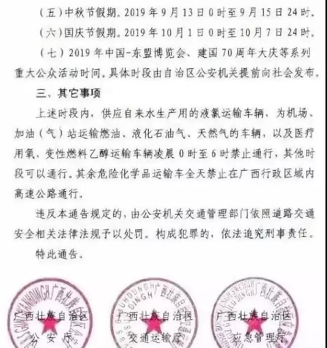 根據廣西壯族自治區公安廳、交通運輸廳、安全生產監督管理局等聯合發布公告文件,2019年10月1日零時至10月7日24時,廣西壯族自治區全區域高速公路禁止危險貨物運輸車輛通行。物流停限,生產停限,嚴查超載,再加上時不時發生的交通事故,大載車司機的無奈只有自己才能體會。