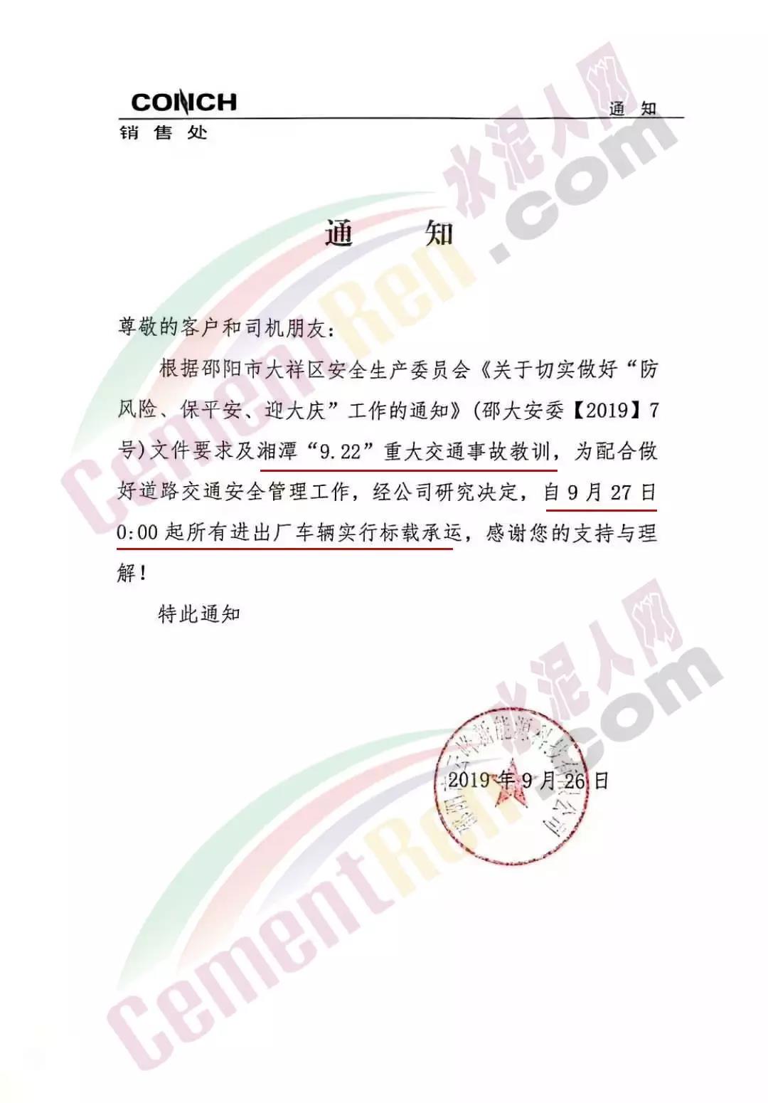 9月26日邵陽市海螺水泥銷售處曾發通知稱:為配合邵陽市大祥區安委會文件要求及湘潭“9.22”重大交通事故教訓,配合做好道路交通安全管理工作。經研究決定自27日0點起所有進出廠車輛實行標載。