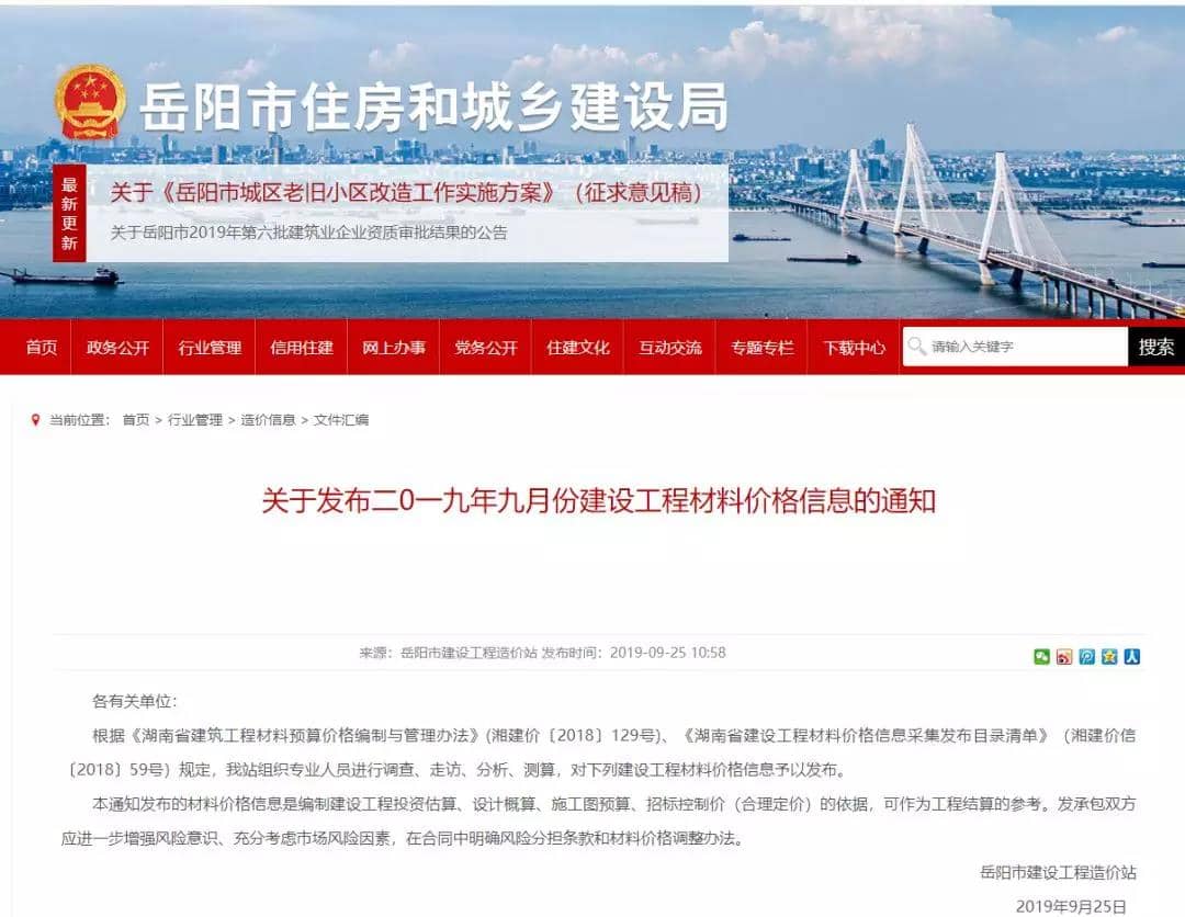 水泥人網消息:湖南省岳陽市砂石全面禁采后,庫存砂石量銳減,出現“有錢無貨、一砂難求”的狀況。五年上漲10倍以上,現仍有強勁的上漲趨勢,價格虛高不下。近日,岳陽市建設工程造價站公開了2019年9月建設工程材料價格信息。