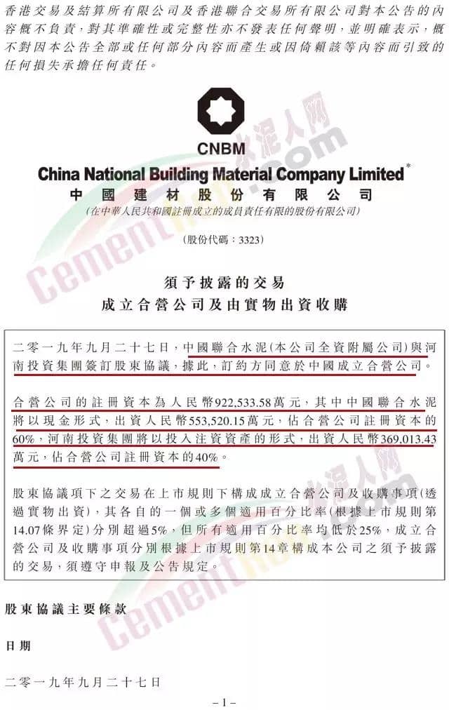 中國建材(03323-HK)公布,2019年9月27日,該公司全資附屬公司中國聯合水泥與河南投資集團將于中國成立合營公司,注冊資本為92.25億元(人民幣。下同)。其中,中國聯合水泥將以現金形式出資55.35億元,占合營公司注冊資本的60%股權;河南投資則以注入資產的形式,出資36.9億元,合營公司注冊資本的40%股權。