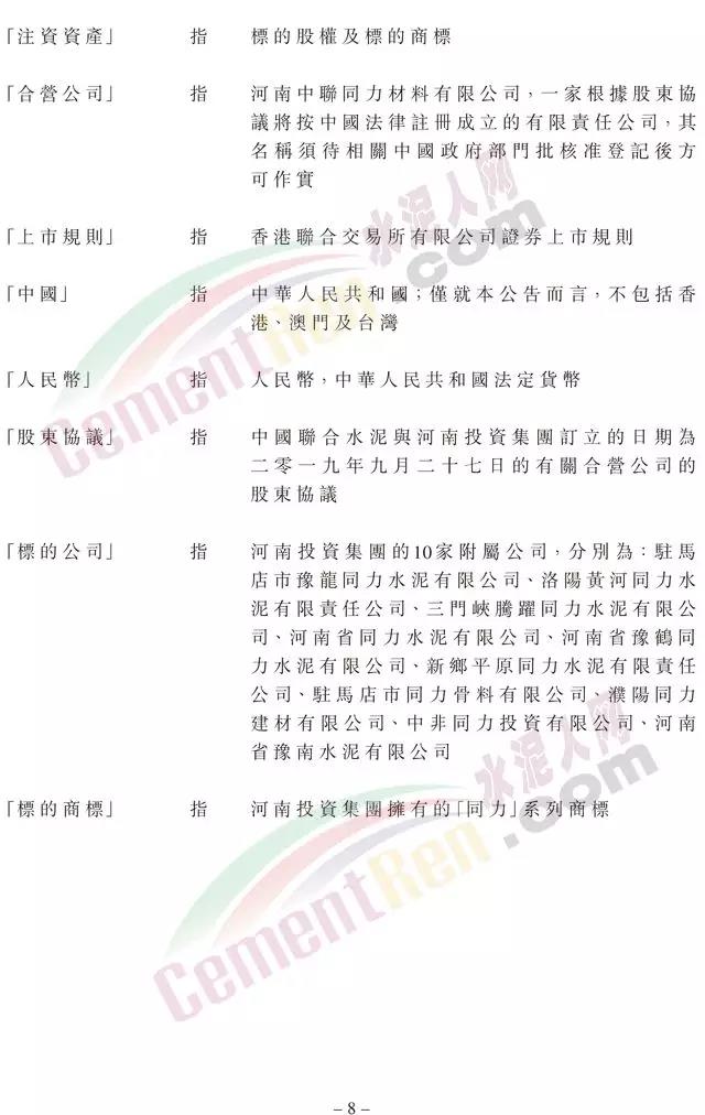 合營公司的營業期限為50年。經合營公司持有三分之二以上表決權的股東同意可延長公司的營業期限。合營公司業務包括制造、銷售水泥及水泥相關產品,以及進出口業務等。