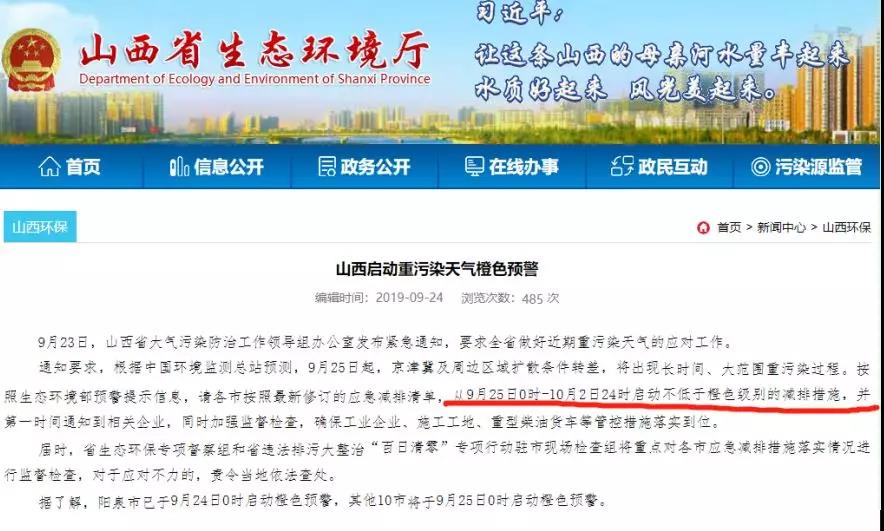10月2日24日起,山西啟解除重污染天氣橙色預警,屆時,工地、企業、施工工地也即將恢復生產和施工。