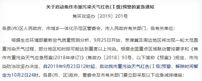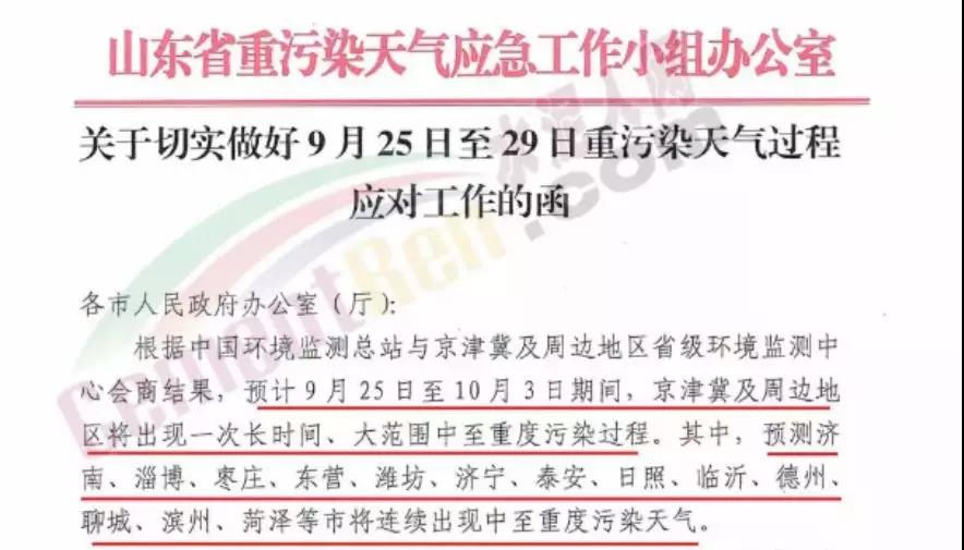 鄭州:自9月24日0時至10月2日24時啟動重污染天氣II級應急響應; 焦作:自9月23日12時起,啟動重污染天氣紅色(Ⅰ級)預警,解除時間暫定為10月2日24時。 除山東省菏澤市之外,山東省濟南、淄博、棗莊、東莞、濰坊、濟寧、泰安、日照、臨沂、德州、聊城、濱州、菏澤等市也將于10月3日解除重污染天氣預警,各大工地、企業也將陸續復產。