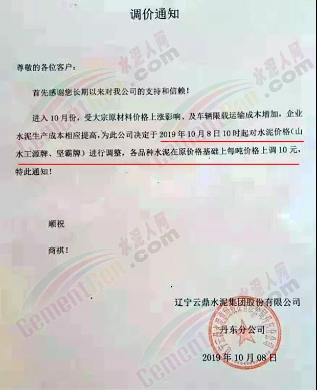 同日,位于東北遼寧的云鼎水泥集團(tuán)也發(fā)布了調(diào)價(jià)通知。云鼎集團(tuán)調(diào)價(jià)通知稱(chēng),進(jìn)入10月份,受大宗原材料價(jià)格上漲影響及車(chē)輛限載運(yùn)輸成本增加,企業(yè)水泥生產(chǎn)成本相應(yīng)提高,為此公司決定于10月8日10時(shí)起對(duì)水泥價(jià)格(山水工源牌、堅(jiān)霸牌)進(jìn)行調(diào)整,各品種水泥價(jià)格在原價(jià)格基礎(chǔ)上每噸上調(diào)10元。