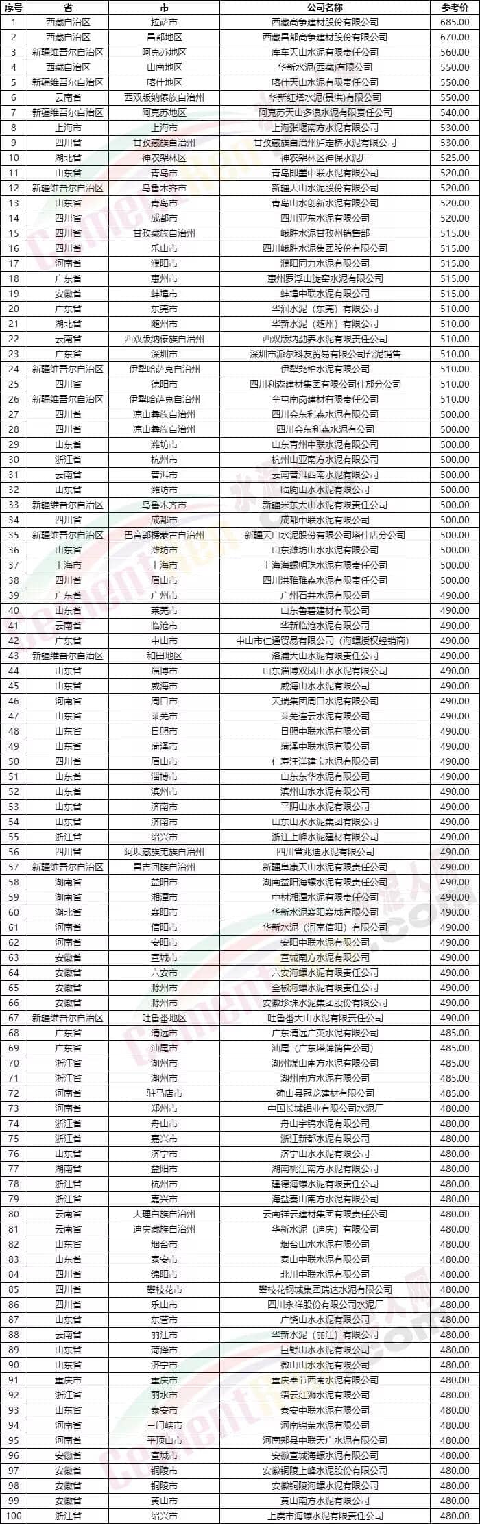 九月底華南廣東省粵東區(qū)域漲價(jià)落實(shí)后,粵西區(qū)域主導(dǎo)企業(yè)中材水泥、海螺水泥、華潤(rùn)水泥等陸續(xù)通知各標(biāo)號(hào)水泥在原執(zhí)行價(jià)格基礎(chǔ)上上調(diào)20元/噸。同期福建省全區(qū)域通知包散同漲20元/噸。(相關(guān)鏈接:金九銀十名不虛傳!九月連十月,海螺、中材、華潤(rùn)等集體漲價(jià))十月初,重慶市部分區(qū)域通知十一期間加強(qiáng)道路運(yùn)輸安全管理,要求重型貨車(chē)(渣土車(chē)、水泥罐車(chē)、以及石子車(chē)等建材材料運(yùn)輸車(chē)輛停運(yùn),導(dǎo)致部分區(qū)域工地停地待料,材料價(jià)格出現(xiàn)小幅上調(diào)。據(jù)了解,國(guó)家統(tǒng)計(jì)局近期公布的2019年9月中旬流通領(lǐng)域重要生產(chǎn)資料市場(chǎng)價(jià)格變動(dòng)情況顯示,24個(gè)省(區(qū)、市)200多個(gè)交易市場(chǎng)的普通硅酸鹽水泥(P.O 42.5散裝)均價(jià)為434.1元/噸。水泥人網(wǎng)信息中心重點(diǎn)監(jiān)控的近千家水泥企業(yè)價(jià)格數(shù)據(jù)顯示,10月初有半數(shù)以上企業(yè)水泥出廠價(jià)格達(dá)到或超過(guò)了9月中旬市價(jià)。附:2019年10月初部分企業(yè)水泥價(jià)格一覽(PO42.5散)