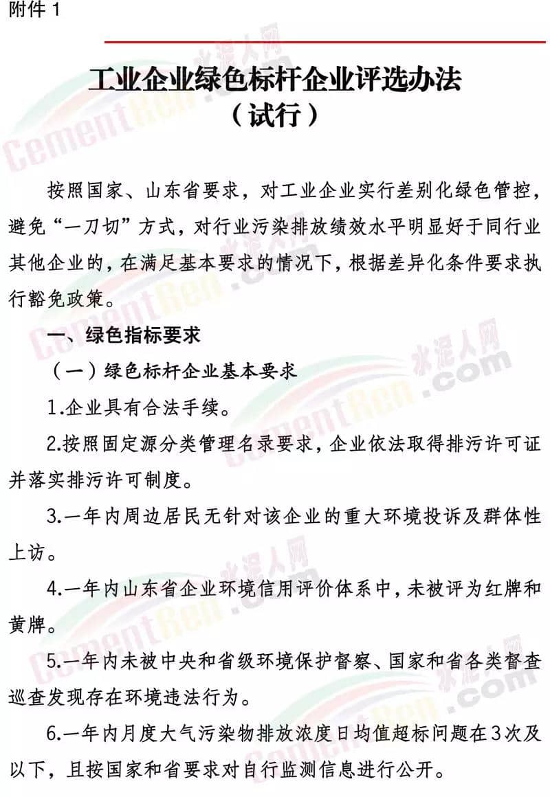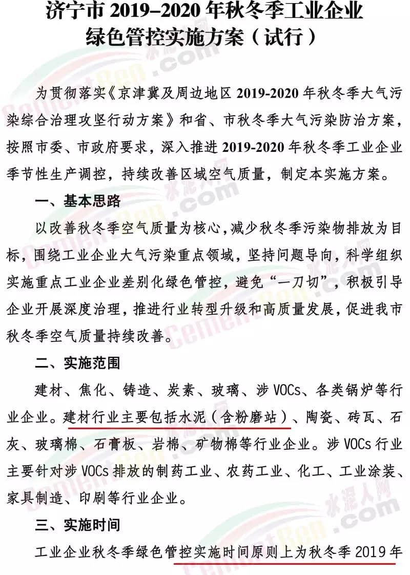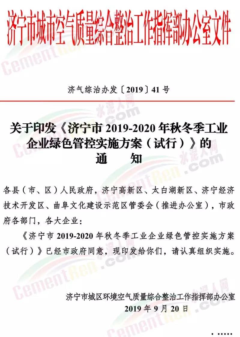 濟寧市2019-2020年秋冬季工業企業綠色管控實施方案(試行)文件要求工業企業秋冬季綠色管控實施時間原則上為秋冬季2019年10月1日至2020年3月31日。根據秋冬季空氣質量改善目標和秋冬季重污染天氣預測情況,可適當縮短或延長各行業綠色管控實施時間。其中建材行業水泥(含粉磨站)、陶瓷、石灰、磚瓦、玻璃棉、石膏板、巖棉、礦物棉等,實施輪流停產; 總體要求(一)實行綠色管控豁免政策。為避免“一刀切”,對行業污染排放績效水平明顯好于同行業其他企業的綠色標桿企業,實行豁免,在2019-2020年秋冬季期間可以不停限產、少停限產。享受豁免政策的綠色標桿企業應經批準后,向社會公開。對于享受豁免政策期間出現嚴重違法違規行為、重大污染事故等不符合豁免要求的,取消其豁免資格。(二)嚴格落實停限產措施。對于不符合豁免要求的企業,應按照國家、省、市秋冬季大氣污染綜合治理攻堅行動方案和綠色管控方案規定,嚴格落實停限產的時間和比例。對于環保手續不全、各類污染物不能穩定達標排放、監測數據造假、涉嫌偷排偷放、未按期完成2019-2020年秋冬季大氣污染綜合治理改造任務的企業,實施停產整治。對屬于《產業結構調整指導目錄》限制類的,提高限產比例或實施停產。(三)優先突出民生保障。對于應停限產企業若涉及供暖、協同處置城市垃圾或危險廢物、保障城市正常運轉或涉及國家戰略性產業的工業企業和重大工程項目等保民生任務的,應優先保障基本民生需求,在滿足保障任務的同時,根據其承擔的協同處置量和供暖面積等參數核定最大允許生產負荷科學制定減排措施。對因保民生任務的,報縣級人民政府批準,并由相關部門按有關要求報上級部門備案。(四)嚴格落實限產比例。對于采用限產方式的企業,要嚴格限產比例,限產比例應當優先采取生產線或生產工序停產方式達到,限產比例原則上以2019年4至10月期間企業正常生產(指生產負荷在75%以上)的平均產量為基準核算。對確實無法停產的生產線或生產設備,或因保民生任務不能完全停產的,應當以企業產品產量或用電量計限產負荷。(五)鼓勵優秀企業發展。凡列入工信部綠色工廠或我市“510”企業培育工程名單的企業,在穩定達標排放的前提下,以相應要求為基礎,可享受不高于25%優惠政策。動態管控對行業污染排放績效水平明顯好于同行業其他企業的工業企業,按照《工業企業綠色標桿企業評選辦法(試行)》申請綠色標桿企業,經屬地政府批準后發放綠色標桿企業證書,可按規定實行不限產或少限產。建材(水泥熟料、粉磨站、陶瓷、磚瓦、石灰、玻璃棉、石膏板、巖棉、礦物棉)、焦化、鑄造、玻璃、炭素、各類鍋爐、涉VOCs等行業所有企業要全部納入管控清單,凡是未納入的,采暖季期間按同行業最嚴標準執行停限產。綠色管控清單實行動態管控,通過治理符合條件的動態納入,不符合要求的動態剔除,及時報市工信局、市生態環境局、市農業農村局備案。對發生以下問題的,立即取消當年豁免資格:對檢查中發現申報過程中弄虛作假的;大氣污染物排放在線監測指標連續超出綠色標桿企業要求24小時的;出現嚴重違法違規行為、重大污染事故的;在國家、省各類督查或巡查和市大氣指揮部檢查中發現問題的;存在應取消豁免資格其它問題的。各縣(市、區)要將綠色標桿企業發現問題情況,及時上報市工信局、市生態環境局、市農業農村局等部門。當國家、省提出更嚴管控措施要求時,按照國家、省要求執行。當我市環境空氣質量低于國家下達的改善目標時,可適當調整綠色管控工作要求。當發生重污染天氣期間,按照國家省市重污染天氣應急預案有關要求執行停產停工。強化責任落實。各縣(市、區)要嚴格落實屬地監管責任,成立專項檢查隊伍,對企業落實停限產情況進行檢查,并建立巡查、整改臺賬。確保企業嚴格執行停限產措施。工信部門要對企業經濟運行做好跟蹤,及時幫助企業處理遇到的問題,做好企業服務。生態環境部門要對綠色管控企業大氣污染物排放指標實行每日監控,對違規排放的企業取消當年豁免資格。農業農村部門要對農藥行業做好跟蹤,及時幫助企業處理遇到的問題。綠色標桿企業要落實主體責任,至少配備一名專職環保員,每天巡查并建立巡查檔案。嚴格督查問責。加大對各地工業企業綠色管控執行情況督導檢查,對應列入本方案停限產企業名單而未列入的、以保障民生為由規避停限產的或未按要求落實停限產措施的企業,一律納入停產管控范圍,并依法依規進行嚴肅查處。凡是在國家、省各類督查或巡查和市大氣指揮部檢查中發現問題的,對涉及的政府部門及有關人員,提交有關部門啟動問責程序。