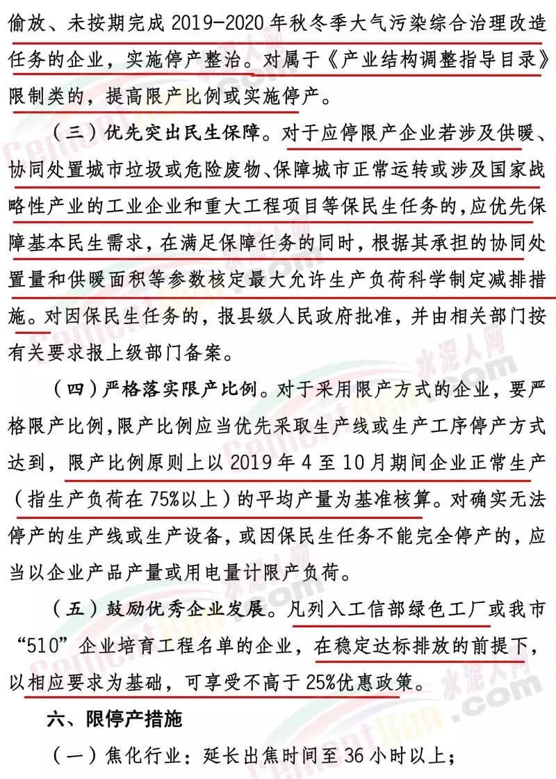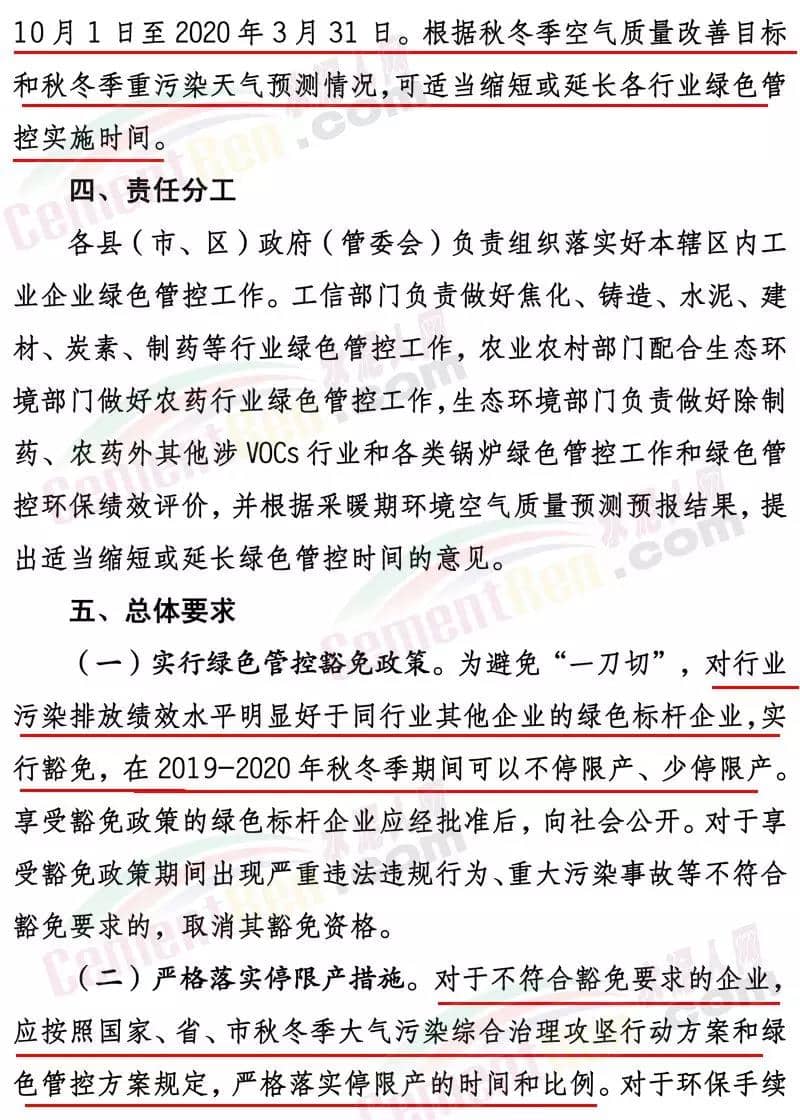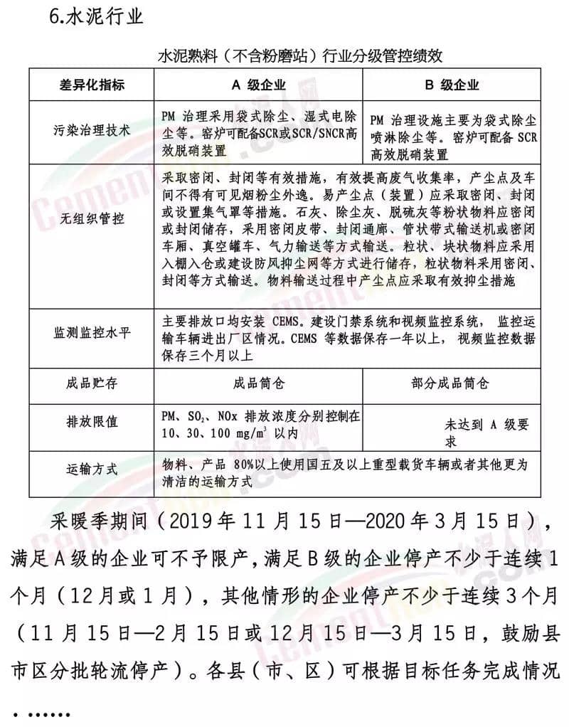 采暖季期間(2019年11月15日—2020年3月15日),滿足A級的企業可不予限產,滿足B級的企業停產不少于連續1個月(12月或1月),其他情形的企業停產不少于連續3個月(11月15日—2月15日或12月15日—3月15日,鼓勵縣市區分批輪流停產)。各縣(市、區)可根據目標任務完成情況和管理實際加嚴要求。如山東省水泥協會出臺更嚴停限產要求,從嚴執行。采暖季期間(2019年11月15日—2020年3月15日),粉磨站停產不少于連續2個月(11月15日—1月15日或1月15日—3月15日,鼓勵縣市區分批輪流停產)。各縣(市、區)可根據目標任務完成情況和管理實際加嚴要求。如山東省水泥協會出臺更嚴停限產要求,從嚴執行。