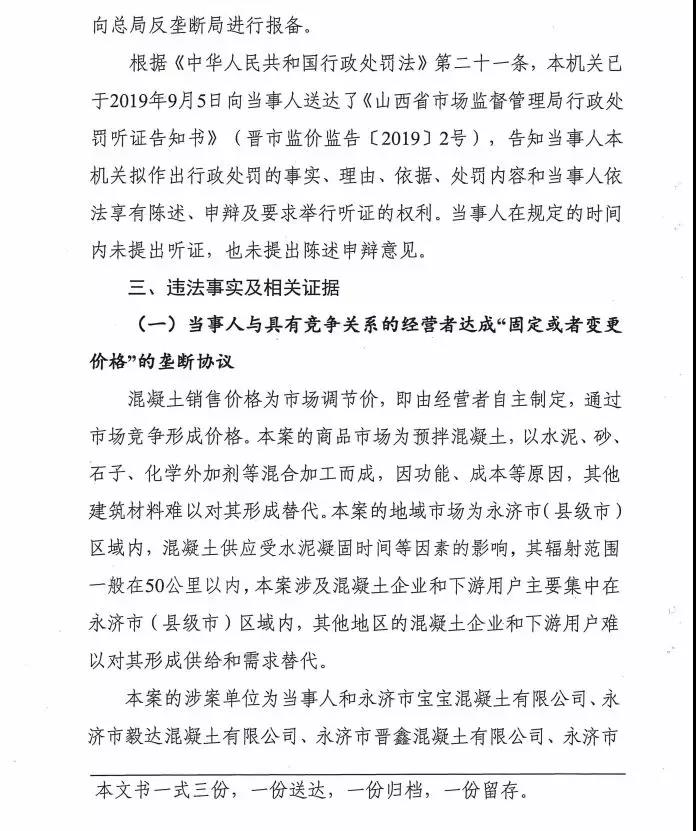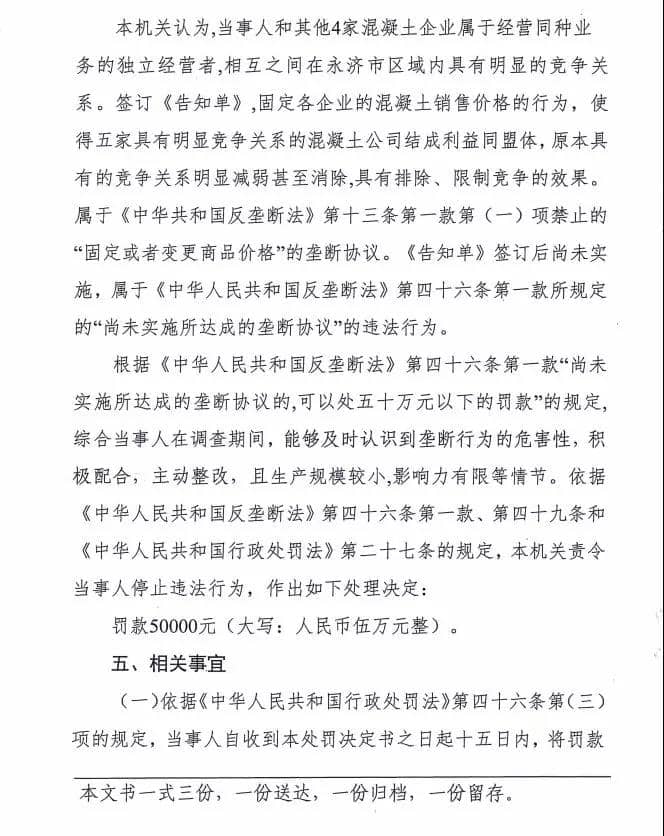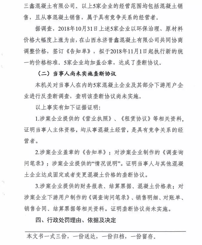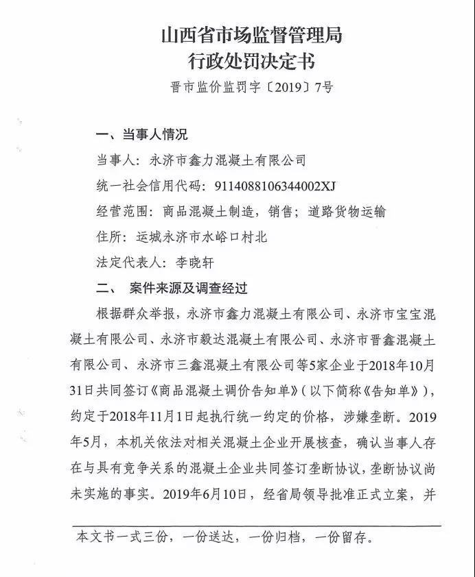 第7號(hào)處罰決定書(shū)提到根據(jù)群眾舉報(bào),永濟(jì)市鑫力混凝土有限公司、永濟(jì)市寶寶混凝土有限公司、永濟(jì)市毅達(dá)混凝土有限公司、永濟(jì)市晉鑫混凝土有限、永濟(jì)市三鑫混凝土有限公司等五家企業(yè)于上年10月31日共同簽訂《商品混凝土調(diào)價(jià)告知單》約定于當(dāng)年11月1日起執(zhí)行統(tǒng)一約定的價(jià)格,涉嫌壟斷。