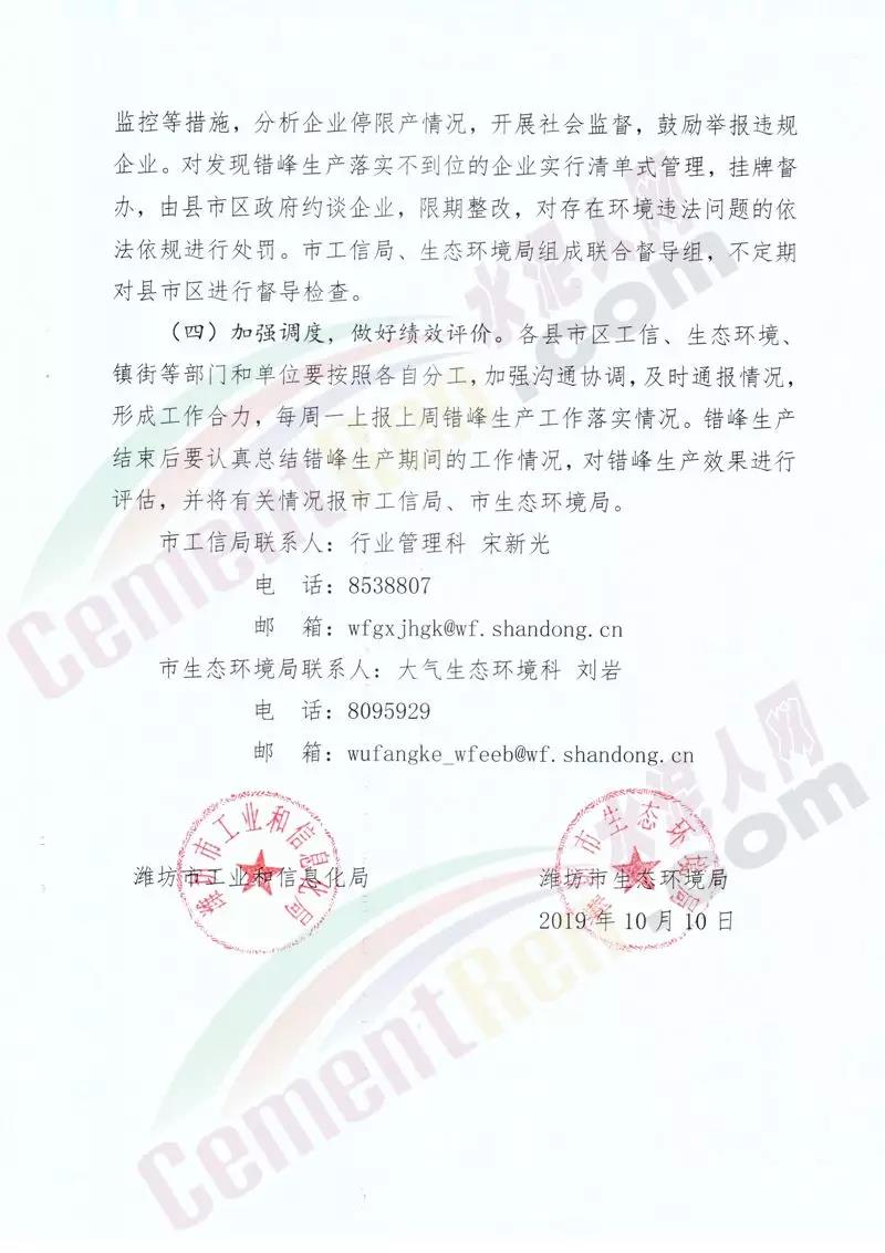 水泥人網(wǎng)消息:山東濰坊市工信局,維坊市生態(tài)環(huán)境局聯(lián)合發(fā)布《關(guān)于組織實施2019-2020年度重點行業(yè)采暖期差異化錯峰生產(chǎn)的通知 》。通知稱:差異化錯峰生產(chǎn)企業(yè)包括 水泥熟料、水泥粉磨站等。對行業(yè)污染排放績效水平明顯好于同行業(yè)其他 企業(yè)滿綠色標桿企業(yè)條件的實施錯峰生產(chǎn)豁免。對水泥企業(yè)熟料生產(chǎn)線實施停產(chǎn),水泥粉磨站限產(chǎn)50%。通知原文如下: