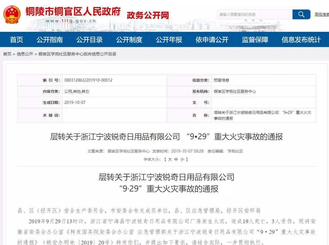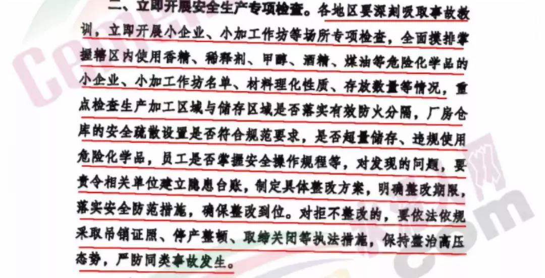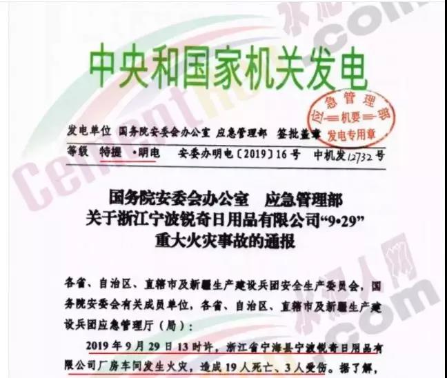 事故發(fā)生后,各級機關(guān)非常重視。10月3日,國務院安委會辦公室、應急管理部下發(fā)了《關(guān)于浙江寧波銳奇日用品有限公司“9•29”重大火災事故的通報》的特提文件。文件指出,初步調(diào)查表明,火災系車間工作人員在一層香水灌裝區(qū)域生產(chǎn)過程中操作不當引發(fā)塑料制品、包裝紙以及三甘酯、異構(gòu)十二烷、香精等原料燃燒。并要求各地立即開展小企業(yè)、小加工作坊等場所安全生產(chǎn)專項檢查。
