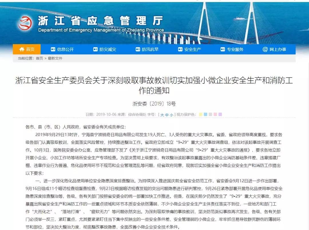 10月6日,浙江省應急管理廳發(fā)布了《浙江省安全生產(chǎn)委員會關(guān)于深刻吸取事故教訓切實加強小微企業(yè)安全生產(chǎn)和消防工作的通知》,稱省政府立即成立了“9•29”重大火災事故調(diào)查組,對該起事故開展調(diào)查工作,并要求各級各部門認真吸取教訓,全面落實風險管控,持續(xù)推進整治工作。