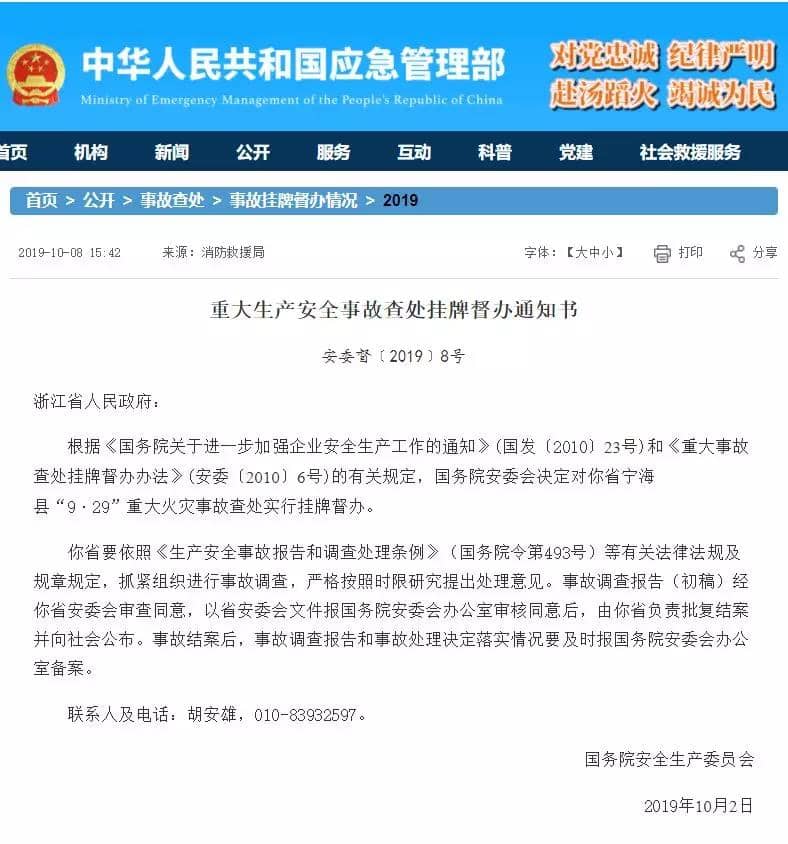 10月8日國家應急管理部官網(wǎng)發(fā)布來自于消防救援局的《重大生產(chǎn)安全事故查處掛牌督辦通知書》(安委督﹝2019﹞8號)提到根據(jù)《國務院關(guān)于進一步加強企業(yè)安全生產(chǎn)工作的通知》(國發(fā)﹝2010﹞23號)和《重大事故查處掛牌督辦辦法》(安委﹝2010﹞6號)的有關(guān)規(guī)定,國務院安委會決定對浙江省寧波市寧海縣“9·29”重大火災事故查處實行掛牌督辦。通知要求浙江省依照《生產(chǎn)安全事故報告和調(diào)查處理條例》(國務院令第493號)等有關(guān)法律法規(guī)及規(guī)章規(guī)定,抓緊組織進行事故調(diào)查,嚴格按照時限研究提出處理意見。