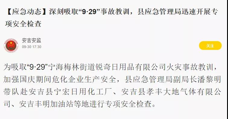 事故發(fā)生后,浙江省湖州市安吉縣應急管理局深刻吸取“9.29”事故教訓,迅速開展了專項安全檢查。由縣應急管理局副局長親自帶隊趕區(qū)域內(nèi)相關(guān)企業(yè)進行專項安全檢查。