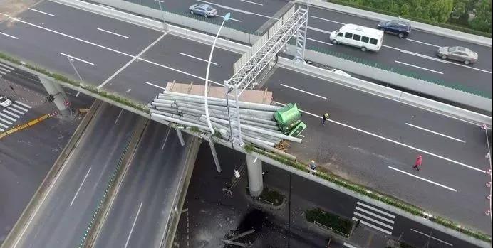 上海中環線高架內圈滬嘉立交出口至滬太路上匝道之間發生一起貨車單車事故,導致車上裝載的水泥管樁散落,部分管樁翻落至地面道路,事故造成中環高架主線橋體內側翹起移位。