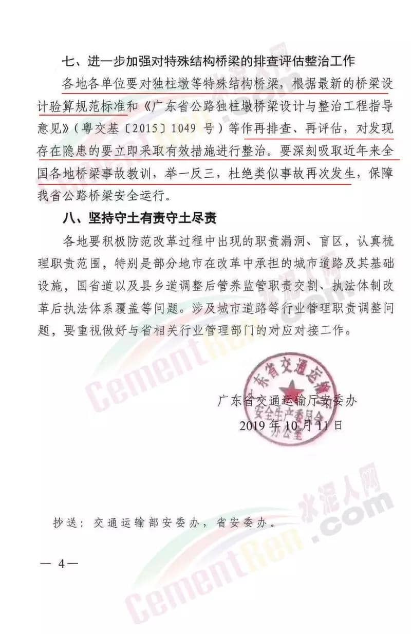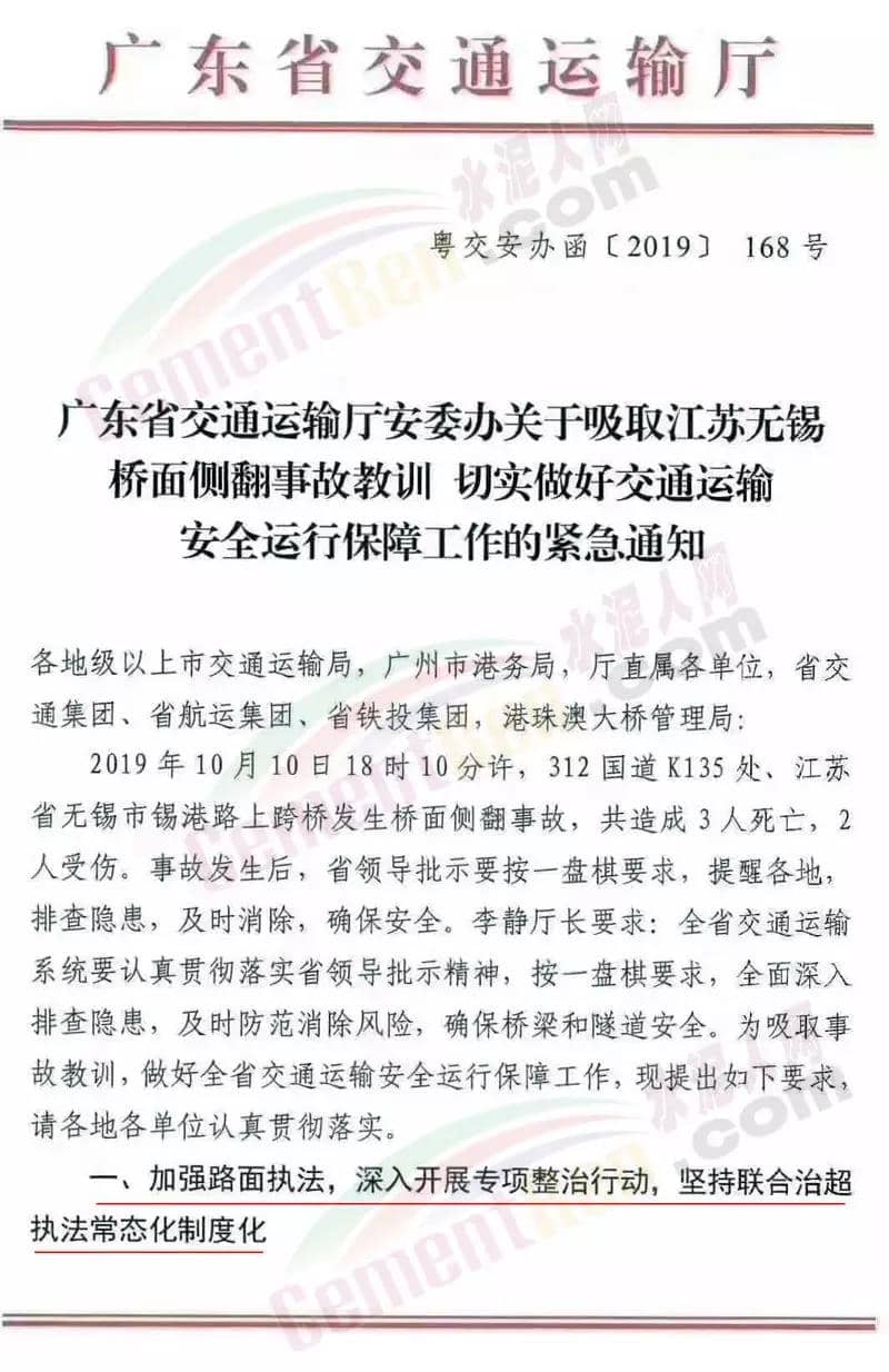 昨日(11日)廣東省交通運輸廳下發《廣東省交通運輸廳安委辦關于吸取江蘇無錫橋面側翻事故教訓 切實做好交通運輸安全運行保障工作的緊急通知》(粵交安辦函【2019】168號)